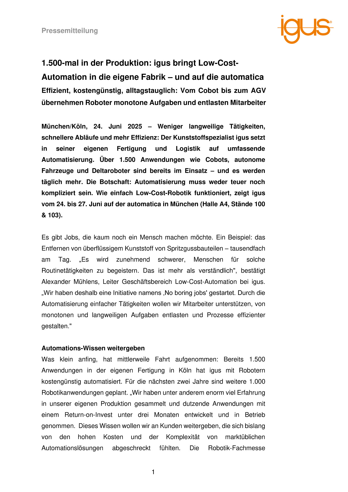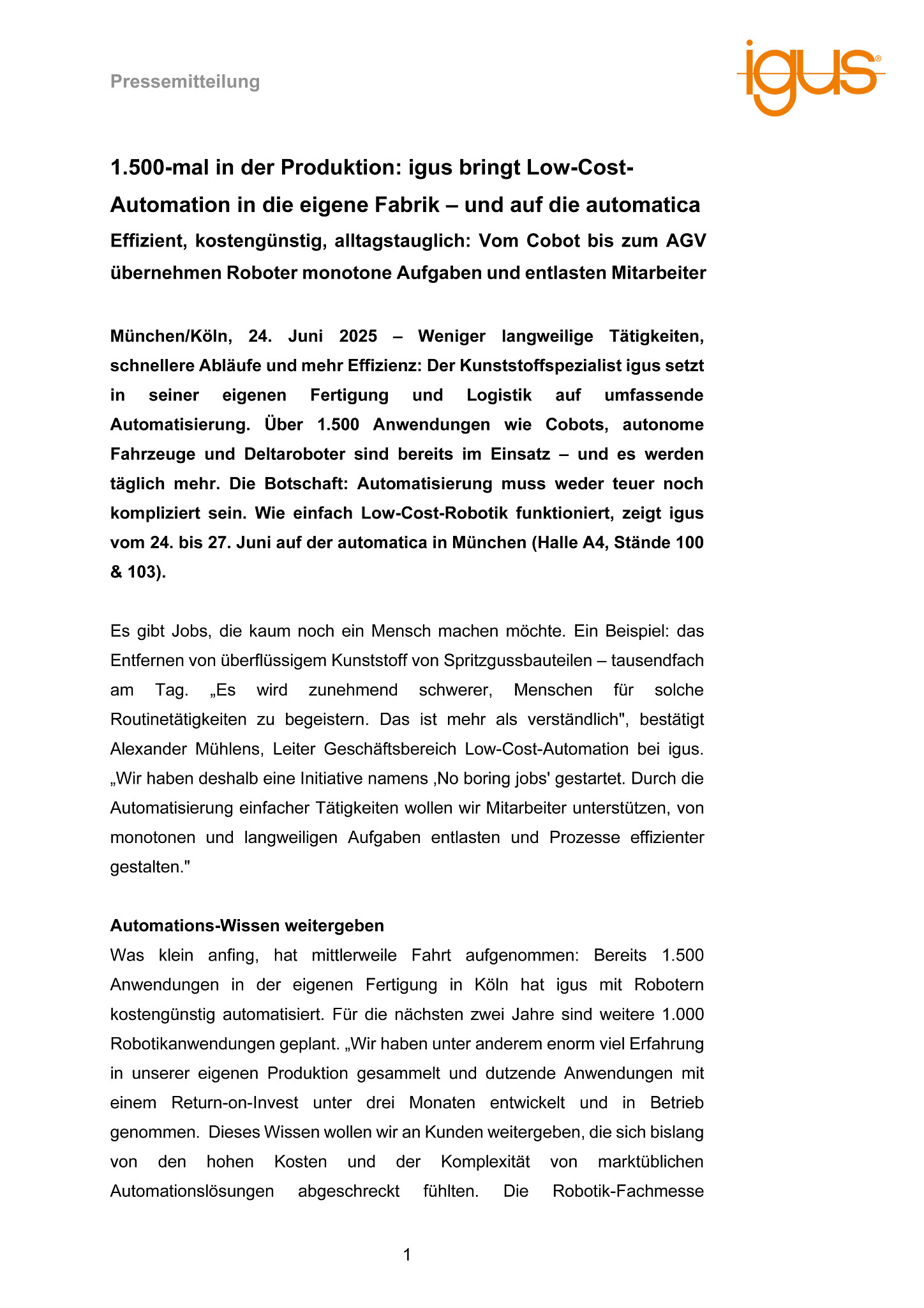 München/Köln, 24. Juni 2025 – Weniger langweilige Tätigkeiten, schnellere Abläufe und mehr Effizienz: Der Kunststoffspezialist igus setzt in seiner eigenen Fertigung und Logistik auf umfassende Automatisierung. Über 1.500 Anwendungen wie Cobots, autonome Fahrzeuge und Deltaroboter sind bereits im Einsatz – und es werden täglich mehr. Die Botschaft: Automatisierung muss weder teuer noch kompliziert sein. Wie einfach Low-Cost-Robotik funktioniert, zeigt igus vom 24. bis 27. Juni auf der automatica in München (Halle A4, Stände 100 & 103).