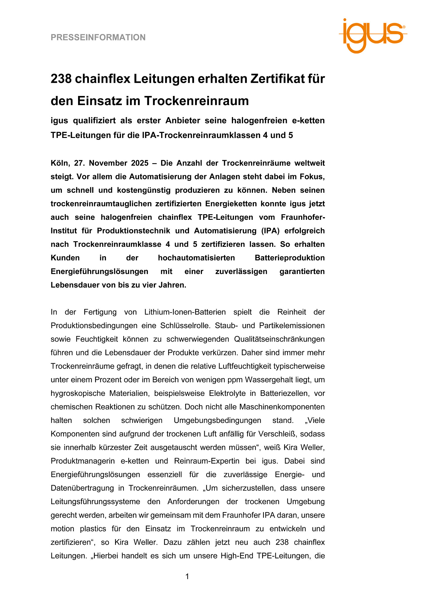 Köln, 27. November 2025 – Die Anzahl der Trockenreinräume weltweit steigt. Vor allem die Automatisierung der Anlagen steht dabei im Fokus, um schnell und kostengünstig produzieren zu können. Neben seinen trockenreinraumtauglichen zertifizierten Energieketten konnte igus jetzt auch seine halogenfreien chainflex TPE-Leitungen vom Fraunhofer-Institut für Produktionstechnik und Automatisierung (IPA) erfolgreich nach Trockenreinraumklasse 4 und 5 zertifizieren lassen. So erhalten Kunden in der hochautomatisierten Batterieproduktion Energieführungslösungen mit einer zuverlässigen garantierten Lebensdauer von bis zu vier Jahren.