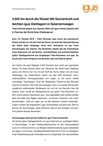 Von Darwin bis nach Adelaide: 3.022 Kilometer quer durch die australische Wüste. Für diese Strecke haben die Teilnehmer der World Solar Challenge genau eine Woche Zeit. Nur mit der Kraft der Sonne dürfen sich die Autos fortbewegen. Die studentischen Teams aus aller Welt entwickeln hierzu unterschiedliche Fahrzeugkonzepte und zeigen so die bunte Vielfalt nachhaltiger Technologien. Einer der diesjährigen Teilnehmer des Rennens stammt aus Aachen. Das Team Sonnenwagen nahm zum zweiten Mal bei dem zweijährlich stattfindenden Wettbewerb teil und fuhr als Sechster über die Ziellinie. Dazu verhalf die Gleitlagertechnik aus iglidur Tribo-Polymeren von dem motion plastics Spezialisten igus. „Die Lagerstellen sind immens wichtig, denn sie halten den Wagen zusammen“, so Kersten Heckmann vom Team Sonnenwagen. „Fällt ein Lager aus, ist die Reparatur äußerst aufwendig.“ Zudem mussten die eingesetzten Lager verschleißfest und leicht sein. Denn je leichter der Sonnenwagen, desto effizienter lässt er sich antreiben und kann eine größere Strecke überwinden.