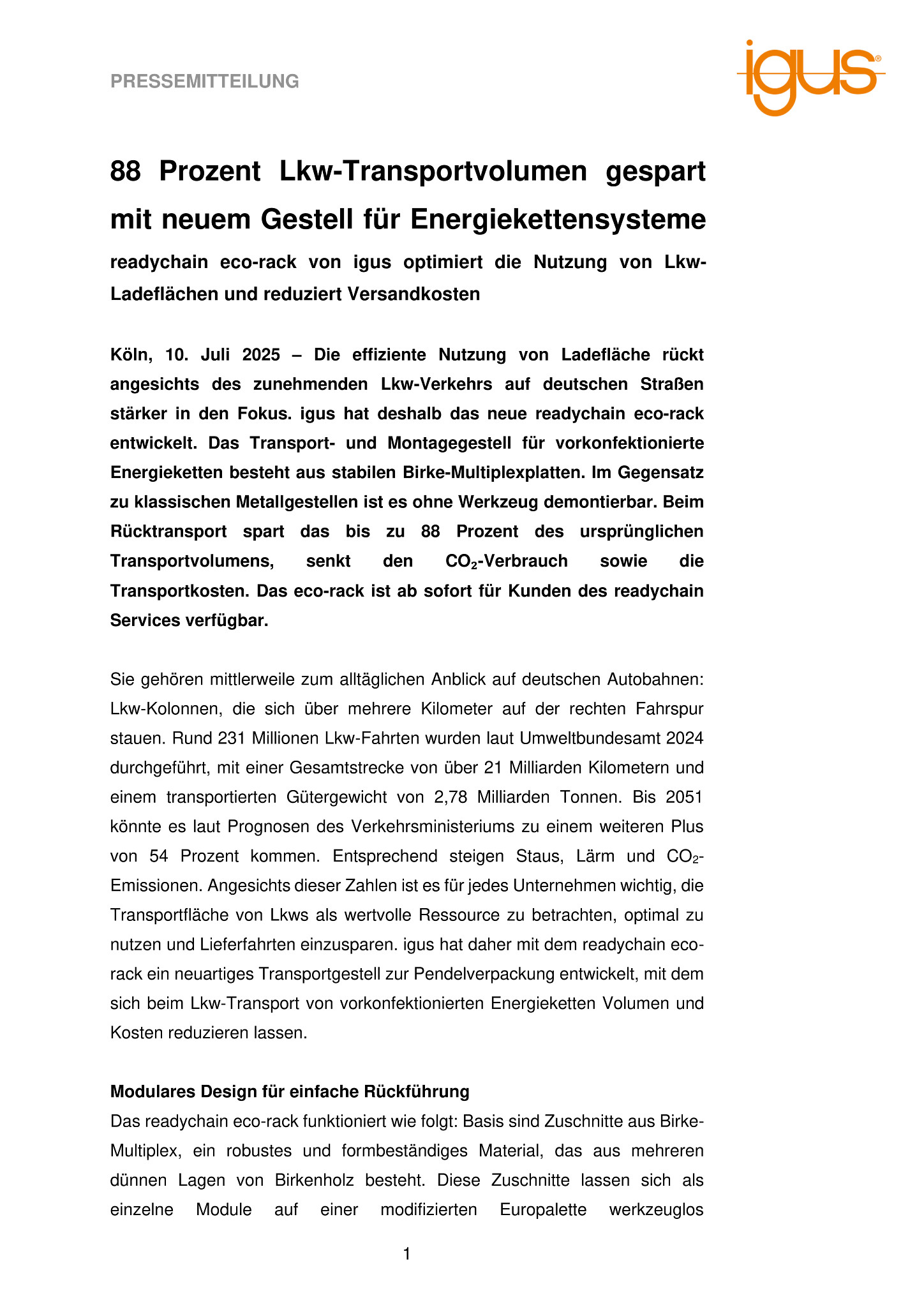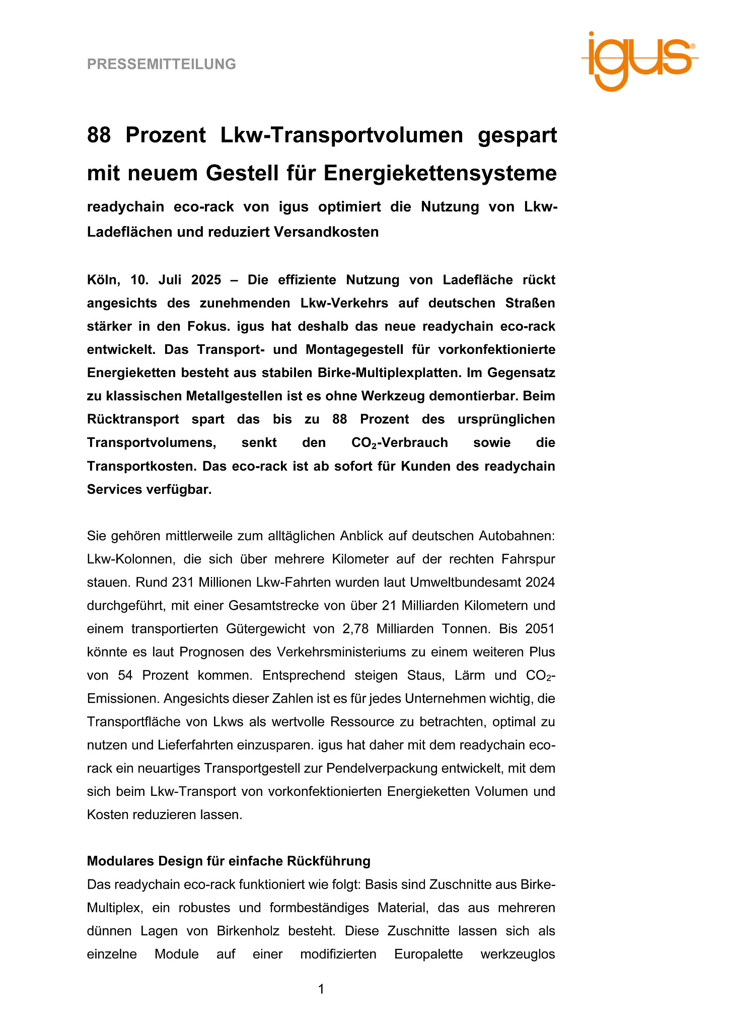 Köln, 10. Juli 2025 – Die effiziente Nutzung von Ladefläche rückt angesichts des zunehmenden Lkw-Verkehrs auf deutschen Straßen stärker in den Fokus. igus hat deshalb das neue readychain eco-rack entwickelt. Das Transport- und Montagegestell für vorkonfektionierte Energieketten besteht aus stabilen Birke-Multiplexplatten. Im Gegensatz zu klassischen Metallgestellen ist es ohne Werkzeug demontierbar. Beim Rücktransport spart das bis zu 88 Prozent des ursprünglichen Transportvolumens, senkt den CO₂-Verbrauch sowie die Transportkosten. Das eco-rack ist ab sofort für Kunden des readychain Services verfügbar.