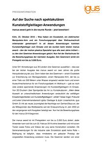 Der manus award ist mit Preisgeldern von bis zu 5.000 Euro dotiert. Jeder Anwender kann sich bis zum 22. Februar 2019 online bewerben und mit kurzen Texten sowie Fotos und Videos der Jury seine Konstruktion vorstellen. Ob Serienanwendungen für die Industrie oder Einzelstück spielt keine Rolle – Bedingung ist lediglich, dass mindestens ein gebauter Prototyp der vorgestellten Anwendung existieren muss. Die Gewinner werden von einer Experten-Jury aus Wissenschaft, Forschung und Fachmedien bestimmt und auf der Hannover Messe 2019 ausgezeichnet.