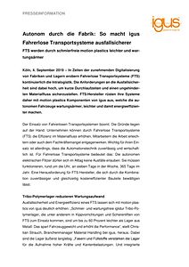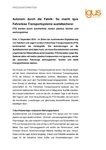 Köln, 4. September 2019 – In Zeiten der zunehmenden Digitalisierung von Fabriken und Lagern erobern Fahrerlose Transportsysteme (FTS) kontinuierlich die Intralogistik. Die Anforderungen an die Ausfallsicherheit sind dabei hoch, um kurze Durchlaufzeiten und einen ungehinderten Materialfluss sicherzustellen. FTS-Hersteller rüsten ihre Systeme daher mit motion plastics Komponenten von igus aus, welche die autonomen Fahrzeuge wartungsärmer, leichter und damit energieeffizienter machen.