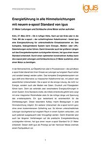 Köln, 27. März 2019 – Ob in luftiger Höhe, flach auf der Erde oder in die Tiefe. Mit der e-spool – der schleifringfreien Kabeltrommel – bietet igus eine Energiezuführung für unterschiedliche Einsatzszenarien an. Das kompakte, federgetriebene System kann Energie-, Medien- oder LWL-Datenleitungen sicher führen. Damit Anwender auch bei größeren Längen auf das Energiekettensystem zurückgreifen können, hat igus einen neuen Standard entwickelt. Durch einen optimierten konstruktiven Aufbau kann die e-spool jetzt Leitungen und Schläuche bis zu 21 Meter ausfahren, ohne einen Motor zu benötigen.