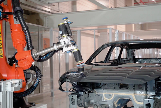 Für das automatische Ausbessern von Lackunebenheiten hat das spanische Ingenieurbüro Procon zwei Roboterzellen entwickelt, die in Reihe geschaltet arbeiten. Die Karosserien fahren nach dem Lackieren über eine Förderstrecke in die erste Zelle. Ein KUKA-Roboter inspiziert dort mit einem Vision-System die Oberfläche des Fahrzeugs. Erkennt er eine Unebenheit, dreht er seinen Endeffektor um 90 Grad, um entionisiertes Wasser auf die Schadensstelle zu sprühen. Nach einer weiteren 90-Grad-Drehung schleift er die Stelle ab. Anschließend fährt die Karosserie in die zweite Zelle. Dort arbeitet ein weiterer Industrieroboter mit einem multifunktionalen Endeffektor, um Schleifrückstände zu beseitigen und die verbesserten Stellen zu polieren.