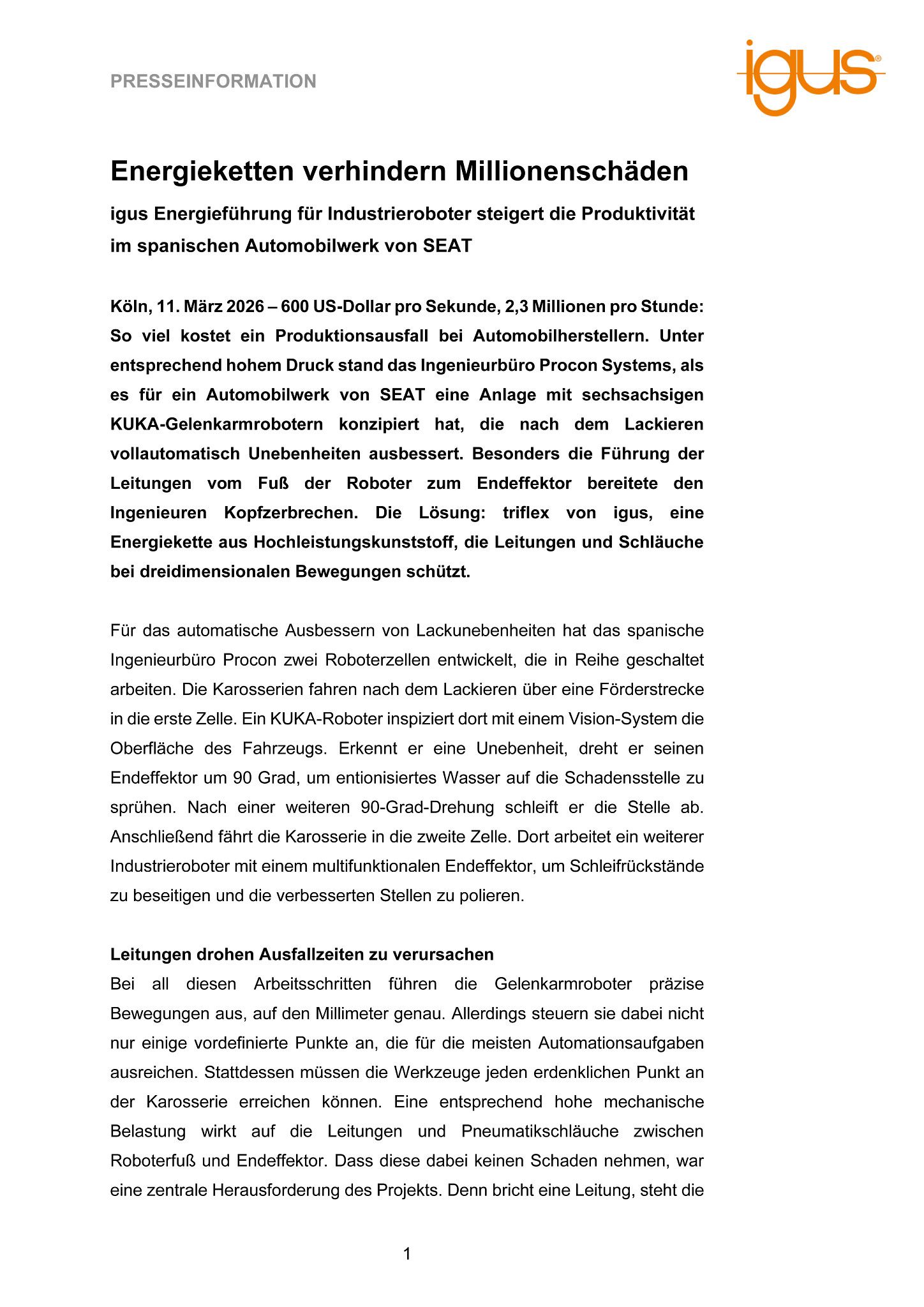 Köln, 11. März 2026 – 600 US-Dollar pro Sekunde, 2,3 Millionen pro Stunde: So viel kostet ein Produktionsausfall bei Automobilherstellern. Unter entsprechend hohem Druck stand das Ingenieurbüro Procon Systems, als es für ein Automobilwerk von SEAT eine Anlage mit sechsachsigen KUKA-Gelenkarmrobotern konzipiert hat, die nach dem Lackieren vollautomatisch Unebenheiten ausbessert. Besonders die Führung der Leitungen vom Fuß der Roboter zum Endeffektor bereitete den Ingenieuren Kopfzerbrechen. Die Lösung: triflex von igus, eine Energiekette aus Hochleistungskunststoff, die Leitungen und Schläuche bei dreidimensionalen Bewegungen schützt.
