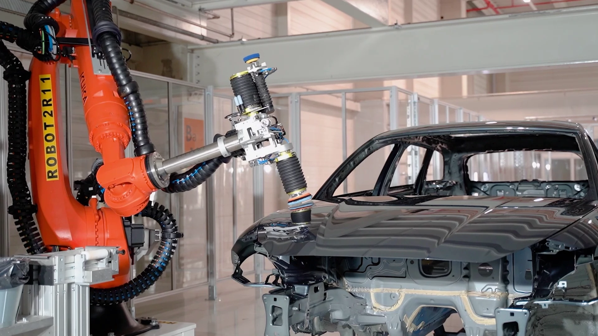 Für das automatische Ausbessern von Lackunebenheiten hat das spanische Ingenieurbüro Procon zwei Roboterzellen entwickelt, die in Reihe geschaltet arbeiten. Die Karosserien fahren nach dem Lackieren über eine Förderstrecke in die erste Zelle. Ein KUKA-Roboter inspiziert dort mit einem Vision-System die Oberfläche des Fahrzeugs. Erkennt er eine Unebenheit, dreht er seinen Endeffektor um 90 Grad, um entionisiertes Wasser auf die Schadensstelle zu sprühen. Nach einer weiteren 90-Grad-Drehung schleift er die Stelle ab. Anschließend fährt die Karosserie in die zweite Zelle. Dort arbeitet ein weiterer Industrieroboter mit einem multifunktionalen Endeffektor, um Schleifrückstände zu beseitigen und die verbesserten Stellen zu polieren.