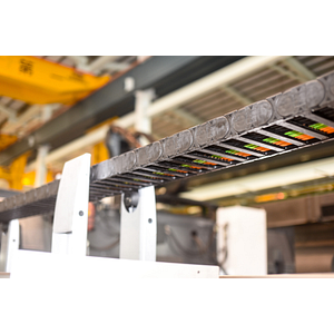 Das Portal-Bearbeitungszentrum ist mit einer Wechseleinrichtung für die Bearbeitungsspindel ausgestattet, sodass Fräsköpfe in verschiedenen Winkeln eingesetzt werden können. Durch die hohe Menge an Spindeln, die beweglich vom zentralen Schaltschrank durch die Anlage zur Fräseinheit geführt werden müssen, erhöht sich die Anzahl an Leitungen und Schläuchen für Energie, Medien und Daten deutlich. „Bei längeren Verfahrwegen kommt hier keine Energiekette dauerhaft ohne Abstützung aus. Schon gar nicht, wenn man noch an das zusätzliche Gewicht durch die Schläuche und Leitungen im Inneren der Kette denkt“, erklärt dazu der General Manager von Kao Ming, Tim Chang. Die guidelok erfüllt genau diese Anforderungen. Die Stützrollen führen dabei das Obertrum der eingesetzten E4.80. Die Rolle kann passiv ausweichen, wenn die Kettenradien sich daran vorbei bewegen. Außerdem ermöglicht der passive Ausweichmechanismus die Bewegung von zwei entgegengesetzten Ketten im gleichen Rinnensystem. Durch das Design der guidelok kann sich die e-kette schnell und vor allem vibrationsarm bewegen. Das wirkt sich positiv auf das Bearbeitungsergebnis aus. Gleichzeitig werden Maschinenstillstände und Wartungsintervalle reduziert, da sich keine Späne zwischen dem Ober- und Untertrum festsetzen können. Der Verfahrweg der guidelok kann auf bis zu 50 Meter ausgedehnt werden.