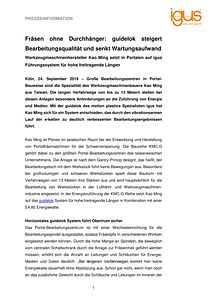 Köln, 24. September 2019 – Große Bearbeitungszentren in Portal-Bauweise sind die Spezialität des Werkzeugmaschinenbauers Kao Ming aus Taiwan. Die langen Verfahrwege von bis zu 13 Metern stellen bei diesen Anlagen besondere Anforderungen an die Zuführung von Energie und Medien. Mit der guidelok des motion plastics Spezialisten igus hat Kao Ming sich für ein System entschieden, das durch den vibrationsarmen Lauf der e-ketten zu deutlich verbesserten Bearbeitungsergebnissen führt.