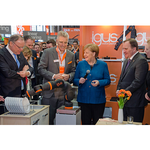 Bundeskanzlerin Angela Merkel sieht bei igus auf der Hannover Messe die Zukunft der Automatisierung