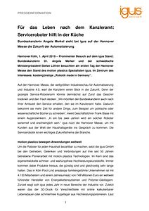 Auf der Hannover Messe, der weltgrößten Industrieschau für Automatisierung und Industrie 4.0, warf die Kanzlerin einen Blick in die Zukunft. Denn der gezeigte Service-Roboterarm könnte demnächst auf Zuruf das Geschirr trocknen und den Tisch decken. „Wir möchten der Bundeskanzlerin auch nach Ihrer Amtszeit den Service erhalten, den sie im Kanzleramt hatte. Dadurch bekommt sie mehr Zeit für andere Dinge, zum Beispiel um politische oder wissenschaftliche Bücher zu schreiben“, meint Geschäftsführer Frank Blase mit einem Augenzwinkern. „In ein bis zwei Jahren wird ein solcher Roboter serienreif und erschwinglich sein.“ igus nutzt die Hannover Messe, um mit Kunden aus der Welt der Haushaltsgeräte ins Gespräch zu kommen. Die Servicerobotik ist ein wichtiges Zukunftsthema der Branche.