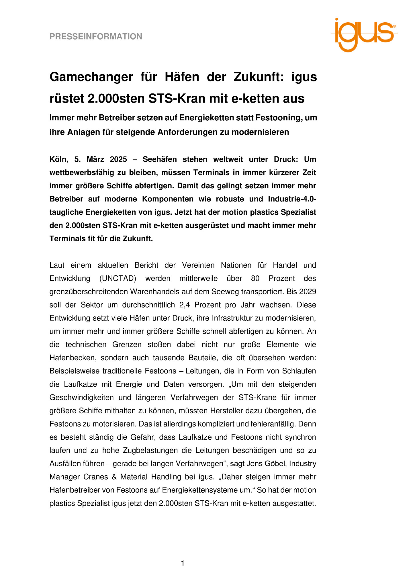 Köln, 5. März 2025 – Seehäfen stehen weltweit unter Druck: Um wettbewerbsfähig zu bleiben, müssen Terminals in immer kürzerer Zeit immer größere Schiffe abfertigen. Damit das gelingt setzen immer mehr Betreiber auf moderne Komponenten wie robuste und Industrie-4.0-taugliche Energieketten von igus. Jetzt hat der motion plastics Spezialist den 2.000sten STS-Kran mit e-ketten ausgerüstet und macht immer mehr Terminals fit für die Zukunft.