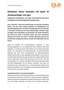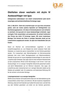 Köln, 2. Mai 2018 – Damit die Linearführungen von igus leise und präzise gleiten, setzt der motion plastics Spezialist auf Gleitlagerfolien aus Hochleistungspolymeren. Um diese in Extremsituationen noch einfacher zu wechseln, hat igus jetzt ein neues Austauschlager entwickelt. Lager entriegeln, Folie rausschieben und austauschen. So einfach funktioniert das Prinzip des drylin W Exchange Lagers. Mit einem kostenlosen Montage Tool können die Folien in wenigen Sekunden direkt auf der Linearschiene ausgetauscht werden. So spart der Instandhalter Zeit und Kosten.