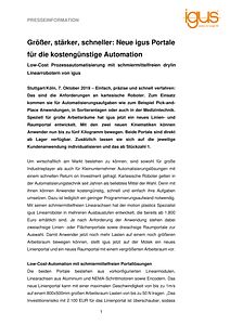 Um wirtschaftlich am Markt bestehen zu können, sind sowohl für große Industrieplayer als auch für Kleinunternehmer Automatisierungslösungen mit einem schnellen Return on Investment gefragt. Kartesische Roboter gelten in der Automatisierungstechnik seit Jahren als beliebtes Mittel der Wahl. Denn mit ihnen können Anwender kostengünstig, schnell und einfach ihre Aufgaben umsetzen. Dazu ist lediglich ein geringer Programmierungsaufwand notwendig. Mit seinen schmiermittelfreien Linearachsen hat der motion plastics Spezialist igus Linearroboter in mehreren Ausbaustufen entwickelt, die bereits ab 1.800 Euro erhältlich sind. Je nach Anforderung der Anwendung stehen dabei zweiachsige Linien- oder Flächenportale sowie dreiachsige Raumportale zur Auswahl. Damit Anwender jetzt noch mehr Lasten auf einem noch größeren Arbeitsraum bewegen können, stellt igus jetzt auf der Motek ein neues Linienportal und ein neues Raumportal mit einem vergrößerten Arbeitsraum vor.