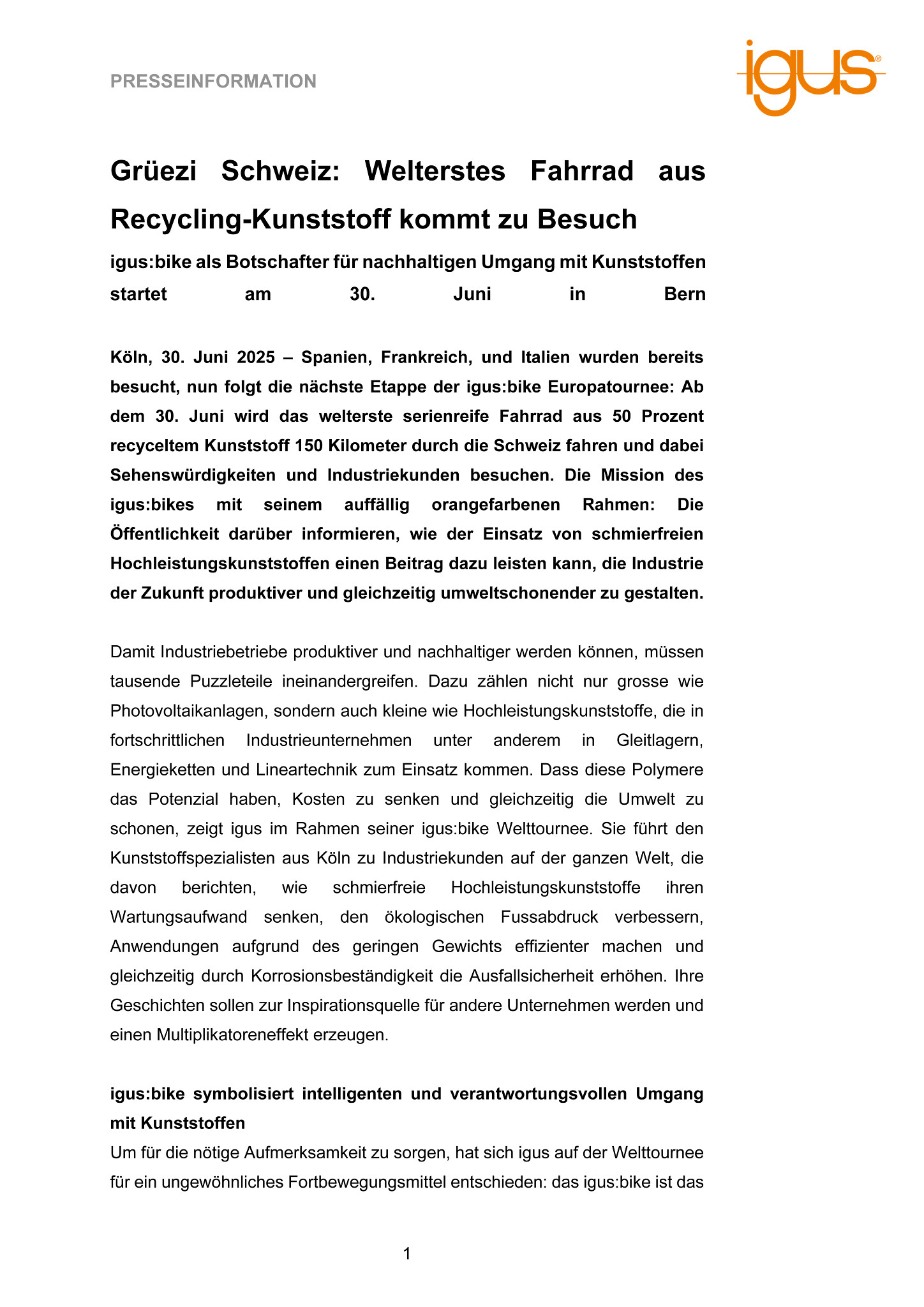 Köln, 30. Juni 2025 – Spanien, Frankreich, und Italien wurden bereits besucht, nun folgt die nächste Etappe der igus:bike Europatournee: Ab dem 30. Juni wird das welterste serienreife Fahrrad aus 50 Prozent recyceltem Kunststoff 150 Kilometer durch die Schweiz fahren und dabei Sehenswürdigkeiten und Industriekunden besuchen. Die Mission des igus:bikes mit seinem auffällig orangefarbenen Rahmen: Die Öffentlichkeit darüber informieren, wie der Einsatz von schmierfreien Hochleistungskunststoffen einen Beitrag dazu leisten kann, die Industrie der Zukunft produktiver und gleichzeitig umweltschonender zu gestalten.