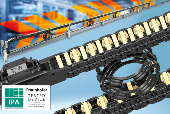 Köln, 22. April 2026 – Ob in der Mikroelektronik, der Halbleiter- oder der Batteriefertigung, überall geht es um Partikelfreiheit und maximale Prozesssicherheit. Mit steigender Automatisierung und stetig wachsenden Anlagen, werden auch die Wege für den Materialtransport länger. Eine zentrale Herausforderung dabei ist, eine zuverlässige Energie- und Datenversorgung bei minimaler Partikelemission zu gewährleisten. Stromschienen übertragen keine Daten, Energieketten brauchen meist komplexe Absaugsysteme für Mikropartikel. Mit der vom Fraunhofer IPA nach ISO Klasse 1 zertifizierten C6 Energiekette in Kombination mit dem neuen e spin Obertrumführungsrad bietet igus hierfür jetzt eine Lösung. Das System ermöglicht eine kompakte und langlebige Energieführung in Reinräumen – auch auf Verfahrwegen bis zu 30 m.