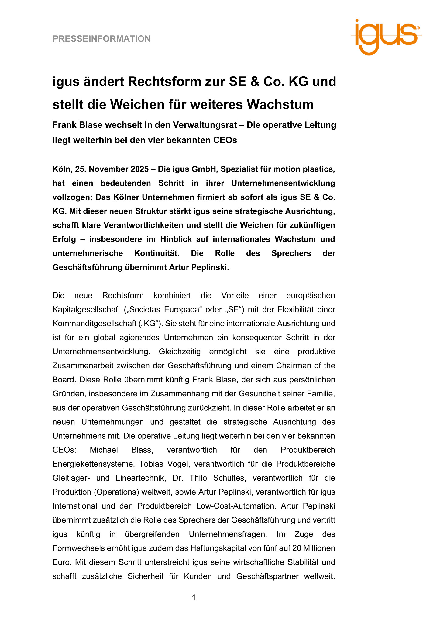 Köln, 25. November 2025 – Die igus GmbH, Spezialist für motion plastics, hat einen bedeutenden Schritt in ihrer Unternehmensentwicklung vollzogen: Das Kölner Unternehmen firmiert ab sofort als igus SE & Co. KG. Mit dieser neuen Struktur stärkt igus seine strategische Ausrichtung, schafft klare Verantwortlichkeiten und stellt die Weichen für zukünftigen Erfolg – insbesondere im Hinblick auf internationales Wachstum und unternehmerische Kontinuität. Die Rolle des Sprechers der Geschäftsführung übernimmt Artur Peplinski.