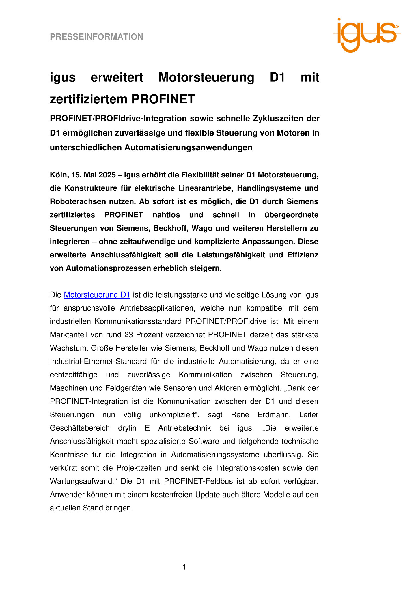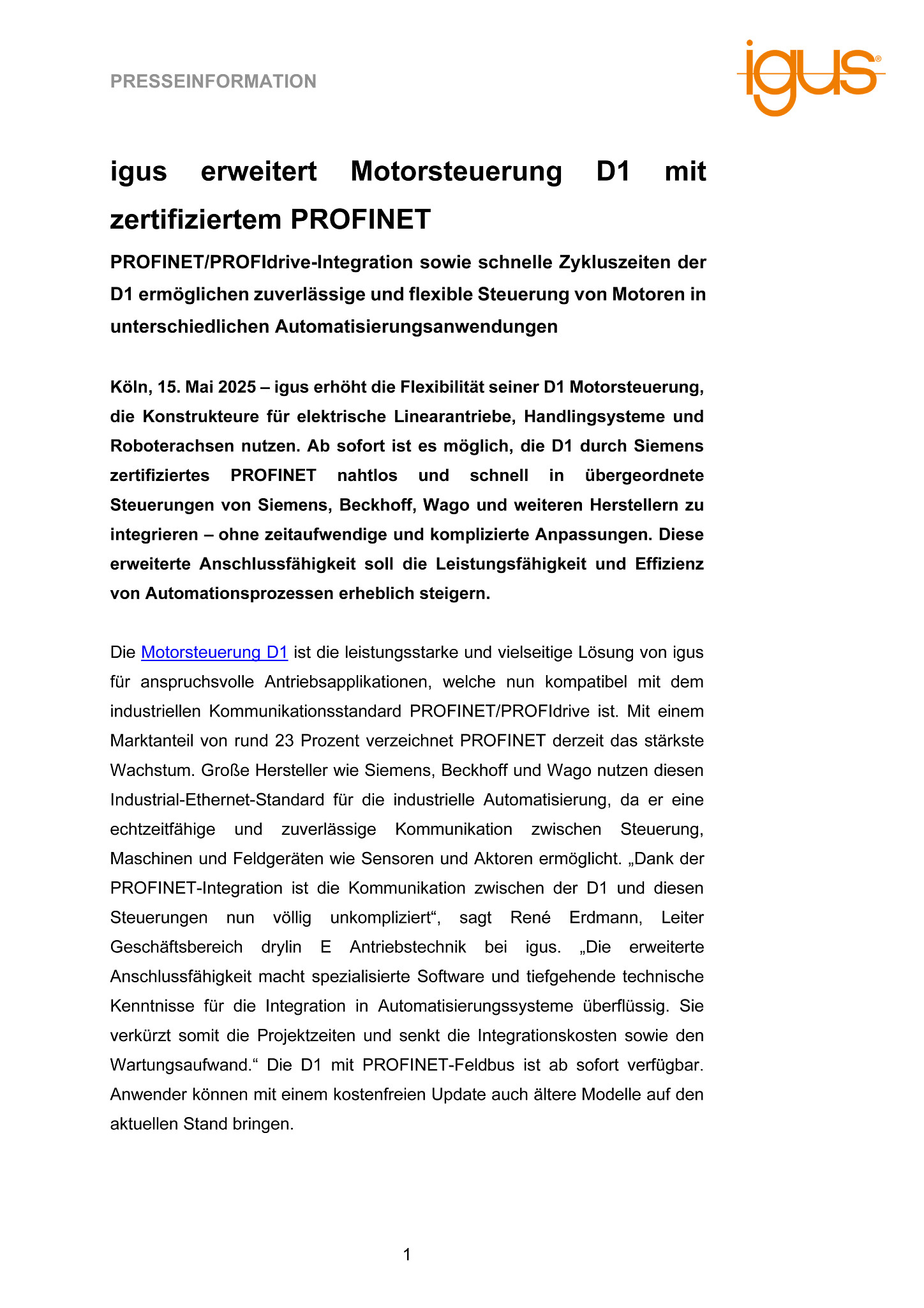 Köln, 15. Mai 2025 – igus erhöht die Flexibilität seiner D1 Motorsteuerung, die Konstrukteure für elektrische Linearantriebe, Handlingsysteme und Roboterachsen nutzen. Ab sofort ist es möglich, die D1 durch Siemens zertifiziertes PROFINET nahtlos und schnell in übergeordnete Steuerungen von Siemens, Beckhoff, Wago und weiteren Herstellern zu integrieren – ohne zeitaufwendige und komplizierte Anpassungen. Diese erweiterte Anschlussfähigkeit soll die Leistungsfähigkeit und Effizienz von Automationsprozessen erheblich steigern.