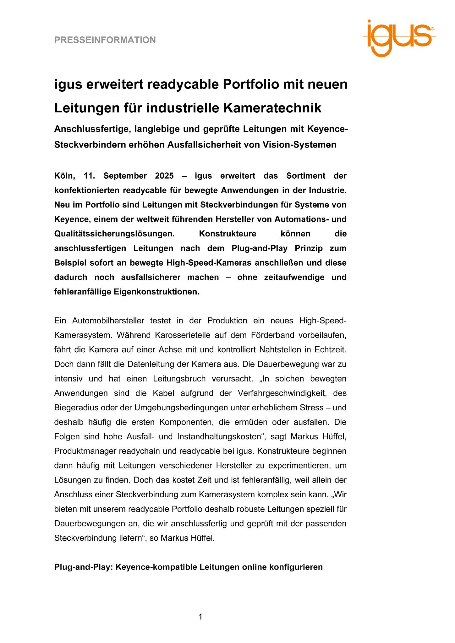 Köln, 11. September 2025 – igus erweitert das Sortiment der konfektionierten readycable für bewegte Anwendungen in der Industrie. Neu im Portfolio sind Leitungen mit Steckverbindungen für Systeme von Keyence, einem der weltweit führenden Hersteller von Automations- und Qualitätssicherungslösungen. Konstrukteure können die anschlussfertigen Leitungen nach dem Plug-and-Play Prinzip zum Beispiel sofort an bewegte High-Speed-Kameras anschließen und diese dadurch noch ausfallsicherer machen – ohne zeitaufwendige und fehleranfällige Eigenkonstruktionen.