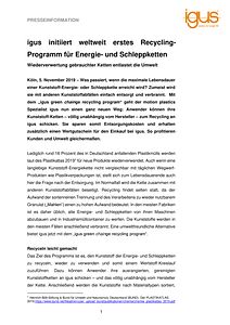 Köln, 5. November 2019 – Was passiert, wenn die maximale Lebensdauer einer Kunststoff-Energie- oder Schleppkette erreicht wird? Zumeist wird sie mit anderen Kunststoffabfällen einfach entsorgt und verbrannt. Mit dem „igus green chainge recycling program“ geht der motion plastics Spezialist igus nun einen ganz neuen Weg: Anwender können ihre Kunststoff-Ketten – völlig unabhängig vom Hersteller – zum Recycling an igus schicken. Sie sparen somit Entsorgungskosten und erhalten zusätzlich einen Wertgutschein für den Einkauf bei igus. So profitieren Kunden und Umwelt gleichermaßen.