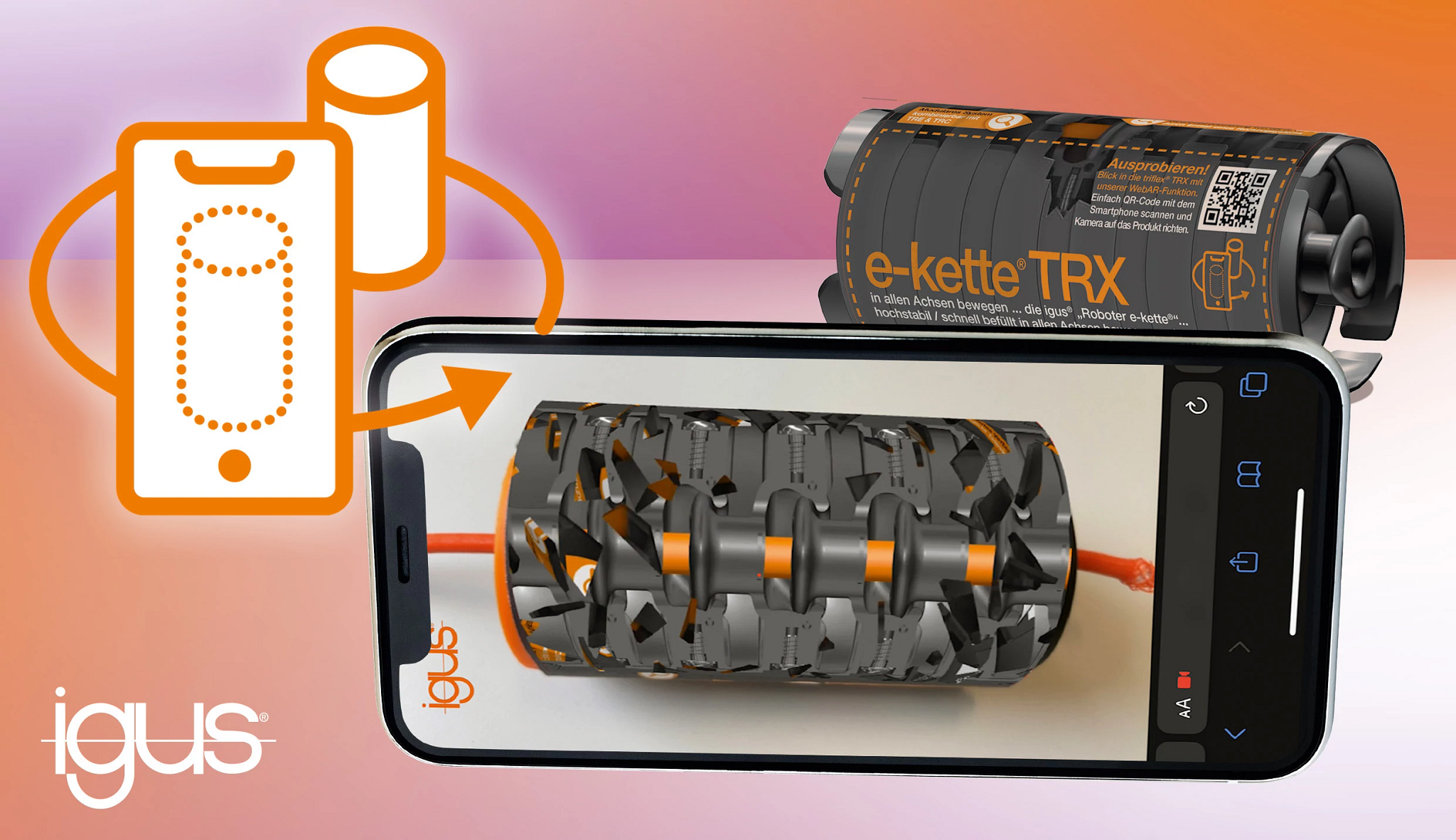 Darüber hinaus setzt igus auf eine neue Form des digitalen Verkaufens und Präsentierens per Augmented Reality (AR), die erweiterte Realität. Ein Beispiel hierfür: die Energiekette der Serie triflex TRX. Vertriebsmitarbeiter und Kunden hatten früher kaum eine Chance, ins Innere einer geschlossenen Musterkette zu blicken. Einige mechanische Prinzipien, die vor allem bei der triflex TRX besonders sind, blieben der Vorstellungskraft überlassen. Hier mischt eine Augmented-Reality-Anwendung die Karten neu. Aktiviert der Mitarbeiter die Software auf seinem Smartphone über einen QR-Code auf der e-kette, überlagert die Anwendung das Produkt auf dem Screen mit einem animierten virtuellen Zwilling. So wird eine Art Röntgenblick ins Innere der Kette auf die Mechanik möglich. Erklärungsbedürftige Produkte werden somit anschaulich und lebendig.
