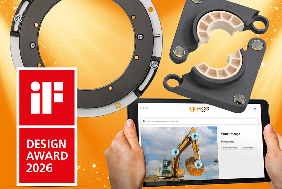 Köln, 1. April 2026 – Wenn Industrieprodukte funktionieren, sich aber nur umständlich montieren oder bedienen lassen, entstehen oft unnötige Stillstände, Fehlbedienungen und Zusatzkosten. igus setzt daher bei der Entwicklung neuer Produkte seinen Fokus auf ein anwendungsorientiertes Design. Für diesen Ansatz haben jetzt gleich drei Produkte den renommierten iF Design Award 2026 gewonnen: Überzeugt hat die internationale Jury ein Drehkranzlager mit integriertem Winkelbegrenzer über 360 Grad, geteilte Flanschlager, die den Lagertausch an schwer zugänglichen Stellen beschleunigen sowie die KI-gestützte App igusGO, die in Sekundenschnelle zeigt, mit welchen igus Produkten sich Anwendungen schmierfrei konstruieren, die Technik verbessern und gleichzeitig Kosten sparen lassen.