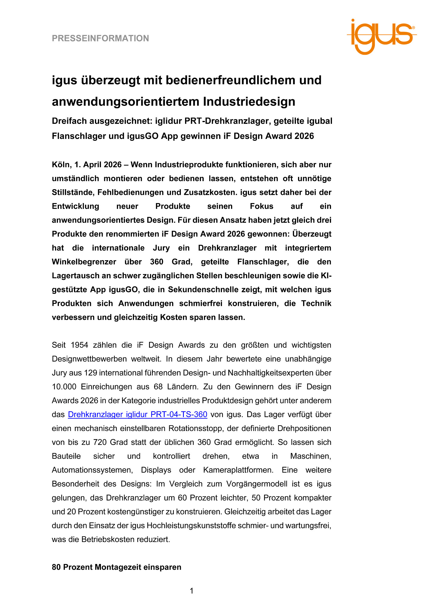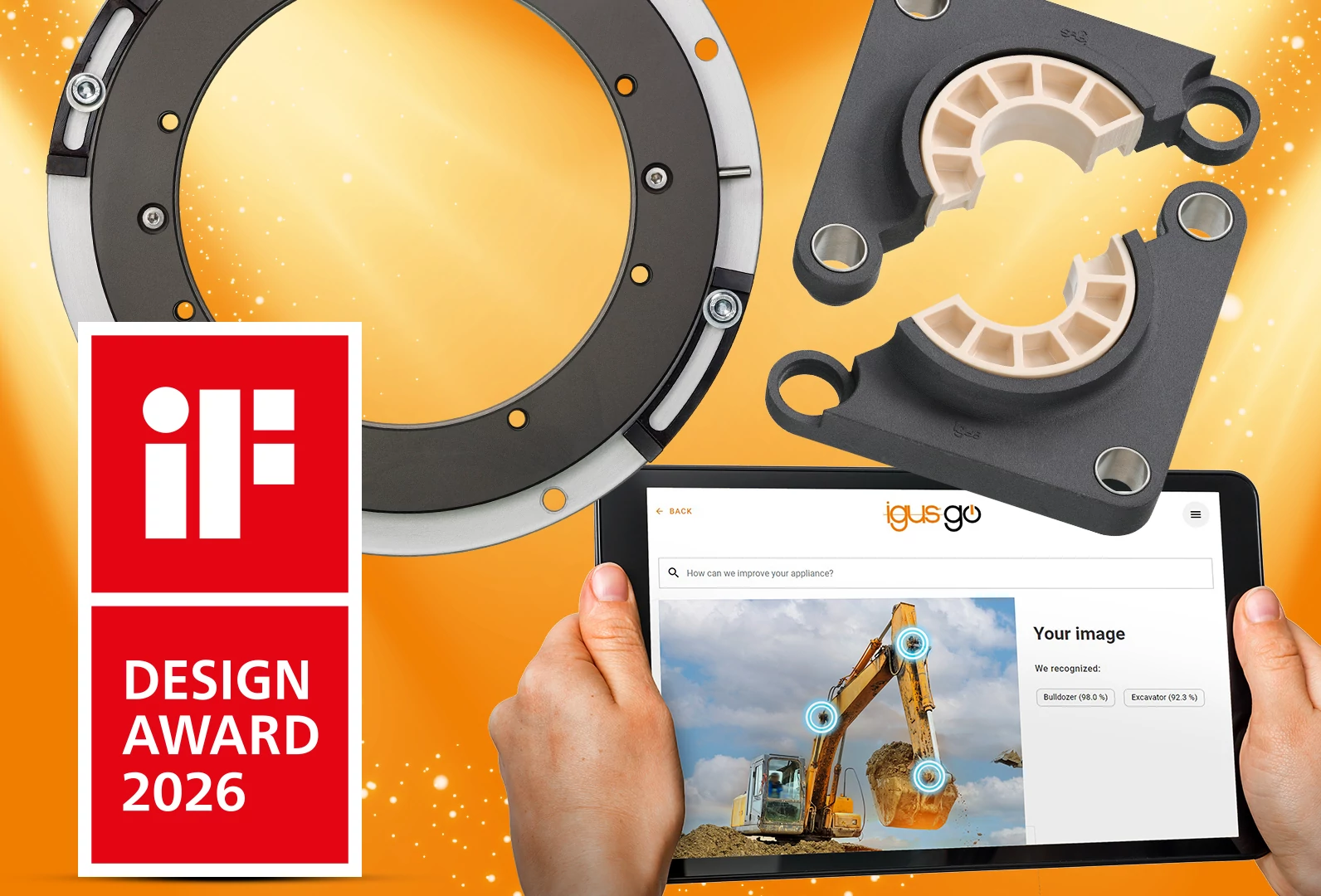 Köln, 1. April 2026 – Wenn Industrieprodukte funktionieren, sich aber nur umständlich montieren oder bedienen lassen, entstehen oft unnötige Stillstände, Fehlbedienungen und Zusatzkosten. igus setzt daher bei der Entwicklung neuer Produkte seinen Fokus auf ein anwendungsorientiertes Design. Für diesen Ansatz haben jetzt gleich drei Produkte den renommierten iF Design Award 2026 gewonnen: Überzeugt hat die internationale Jury ein Drehkranzlager mit integriertem Winkelbegrenzer über 360 Grad, geteilte Flanschlager, die den Lagertausch an schwer zugänglichen Stellen beschleunigen sowie die KI-gestützte App igusGO, die in Sekundenschnelle zeigt, mit welchen igus Produkten sich Anwendungen schmierfrei konstruieren, die Technik verbessern und gleichzeitig Kosten sparen lassen.