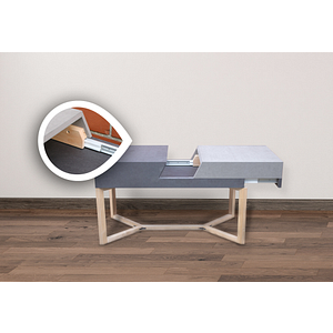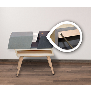 Auch beim Couchtisch ließen sich die Tischler zwei besondere Elemente einfallen. Einerseits besitzt der Tisch eine Drehlade, die sich durch einen Drucktüröffner öffnen und schließen lässt, andererseits lässt sich der Tisch von der Mitte aus aufschieben, sodass Bücher und Zeitschriften schnell im Korpus verschwinden können. „Für diesen Auszug benötigten wir eine Teleskopführung, die langlebig und optisch ansprechend ist. Das drylin Teleskop NT-35 aus Aluminium hat die Schüler direkt überzeugt“, so Manuela Abbing. Bei seinen Teleskopschienen setzt igus auf optisch ansprechendes eloxiertes Aluminium und Gleitelemente aus Hochleistungskunststoffen. Das Tribo-Polymer sorgt für ein ruckelfreies und sanftes Gleiten der Führungen. Doch die Kunststoffgleiter besitzen noch mehr Vorteile: durch den Verzicht auf rollende Körper sind sie sehr leise im Lauf und durch die inkorporierten Festschmierstoffe dabei komplett sauber und wartungsfrei. Da keine Schmierfette zum Einsatz kommen, haftet weder Schmutz noch Staub an den Schienen an. Außerdem besteht keine Gefahr der Verschmutzung bei der Bedienung oder der gelagerten Bücher und Zeitschriften. Damit eignen sich die Schienen optimal für Möbel und Design.