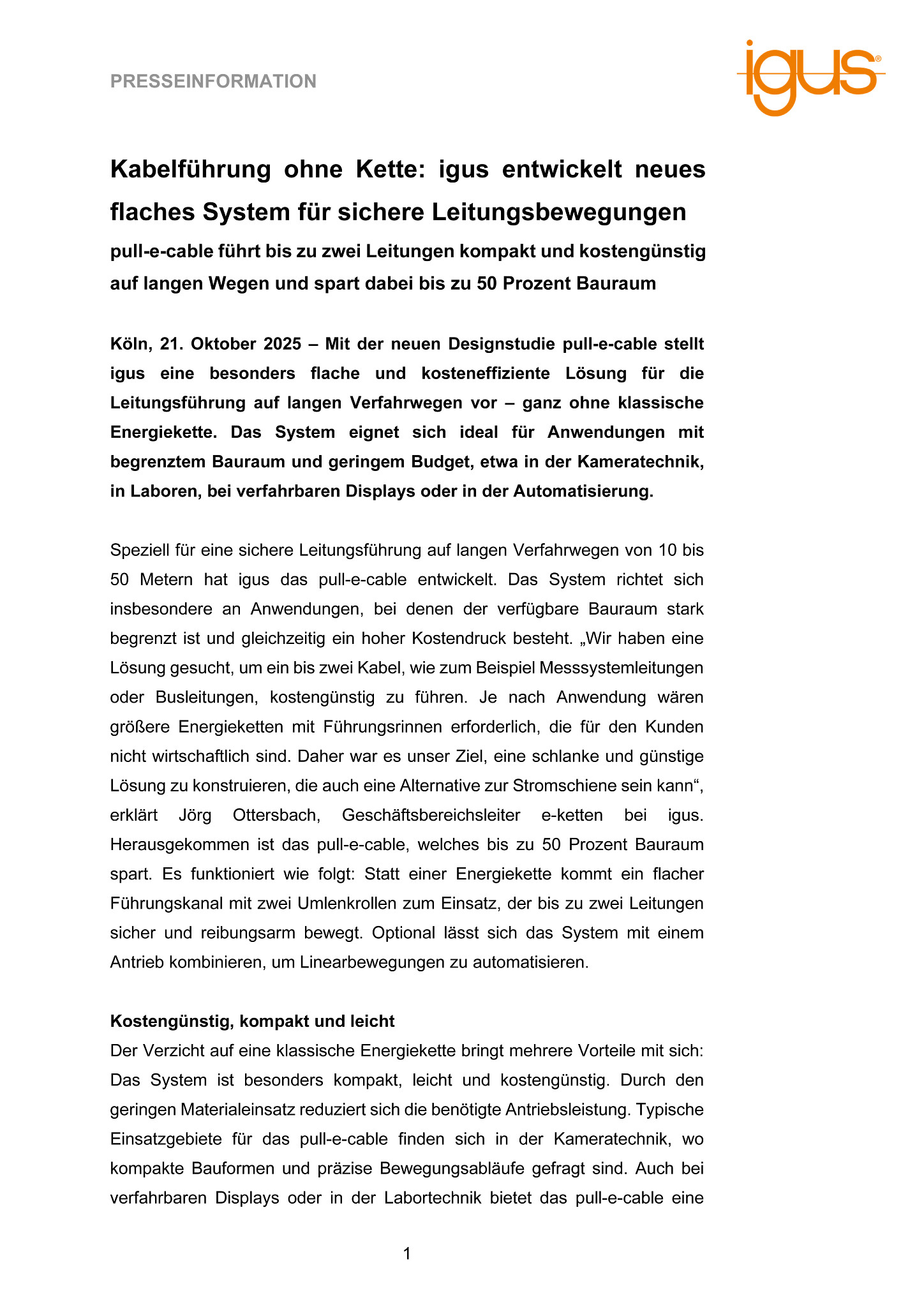 Köln, 21. Oktober 2025 – Mit der neuen Designstudie pull-e-cable stellt igus eine besonders flache und kosteneffiziente Lösung für die Leitungsführung auf langen Verfahrwegen vor – ganz ohne klassische Energiekette. Das System eignet sich ideal für Anwendungen mit begrenztem Bauraum und geringem Budget, etwa in der Kameratechnik, in Laboren, bei verfahrbaren Displays oder in der Automatisierung.