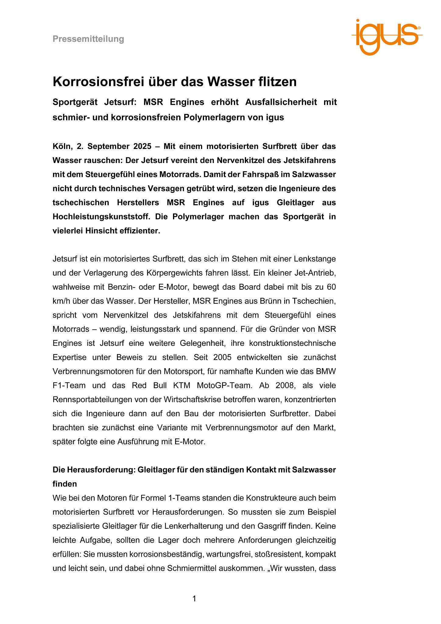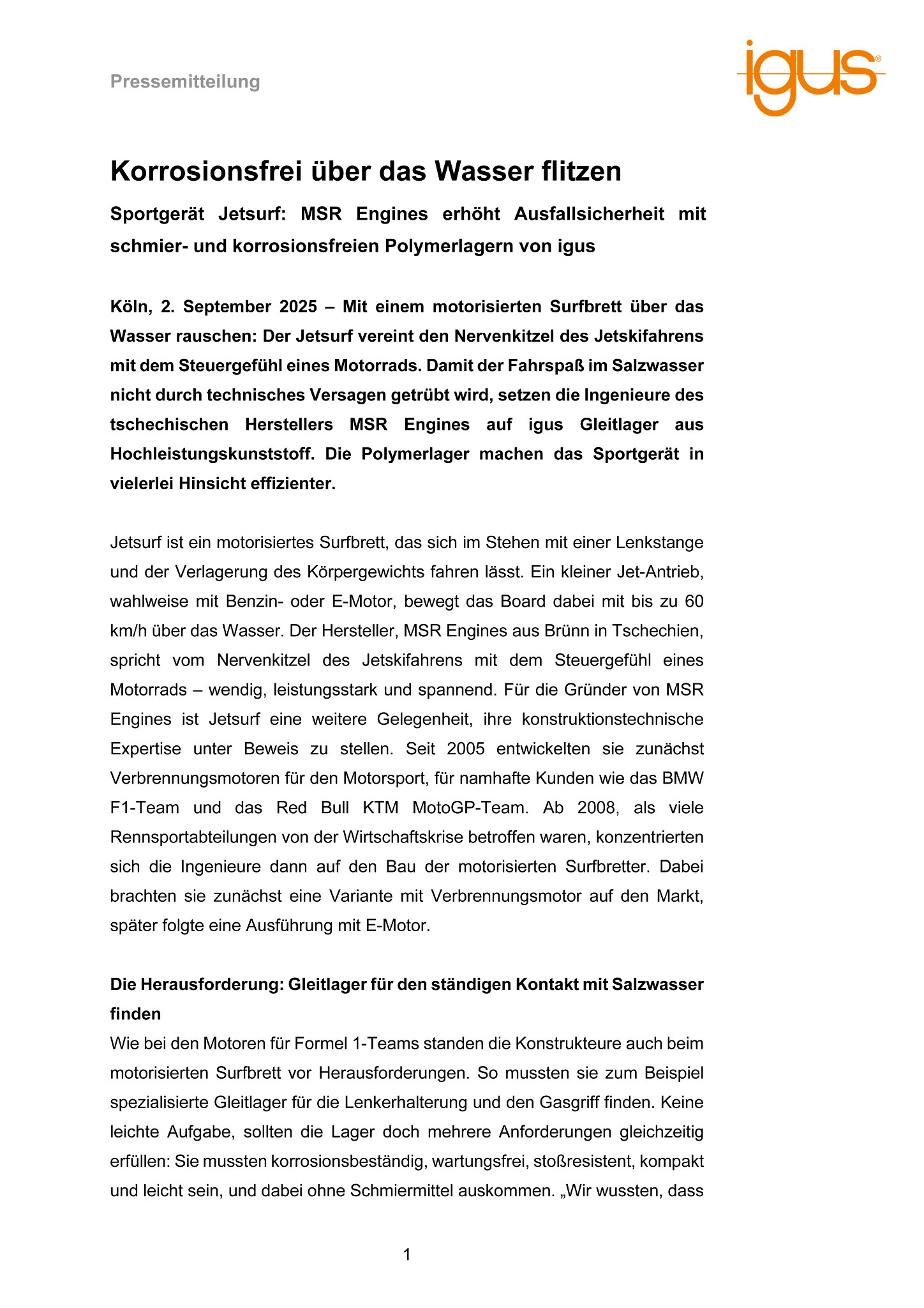 Köln, 2. September 2025 – Mit einem motorisierten Surfbrett über das Wasser rauschen: Der Jetsurf vereint den Nervenkitzel des Jetskifahrens mit dem Steuergefühl eines Motorrads. Damit der Fahrspaß im Salzwasser nicht durch technisches Versagen getrübt wird, setzen die Ingenieure des tschechischen Herstellers MSR Engines auf igus Gleitlager aus Hochleistungskunststoff. Die Polymerlager machen das Sportgerät in vielerlei Hinsicht effizienter.