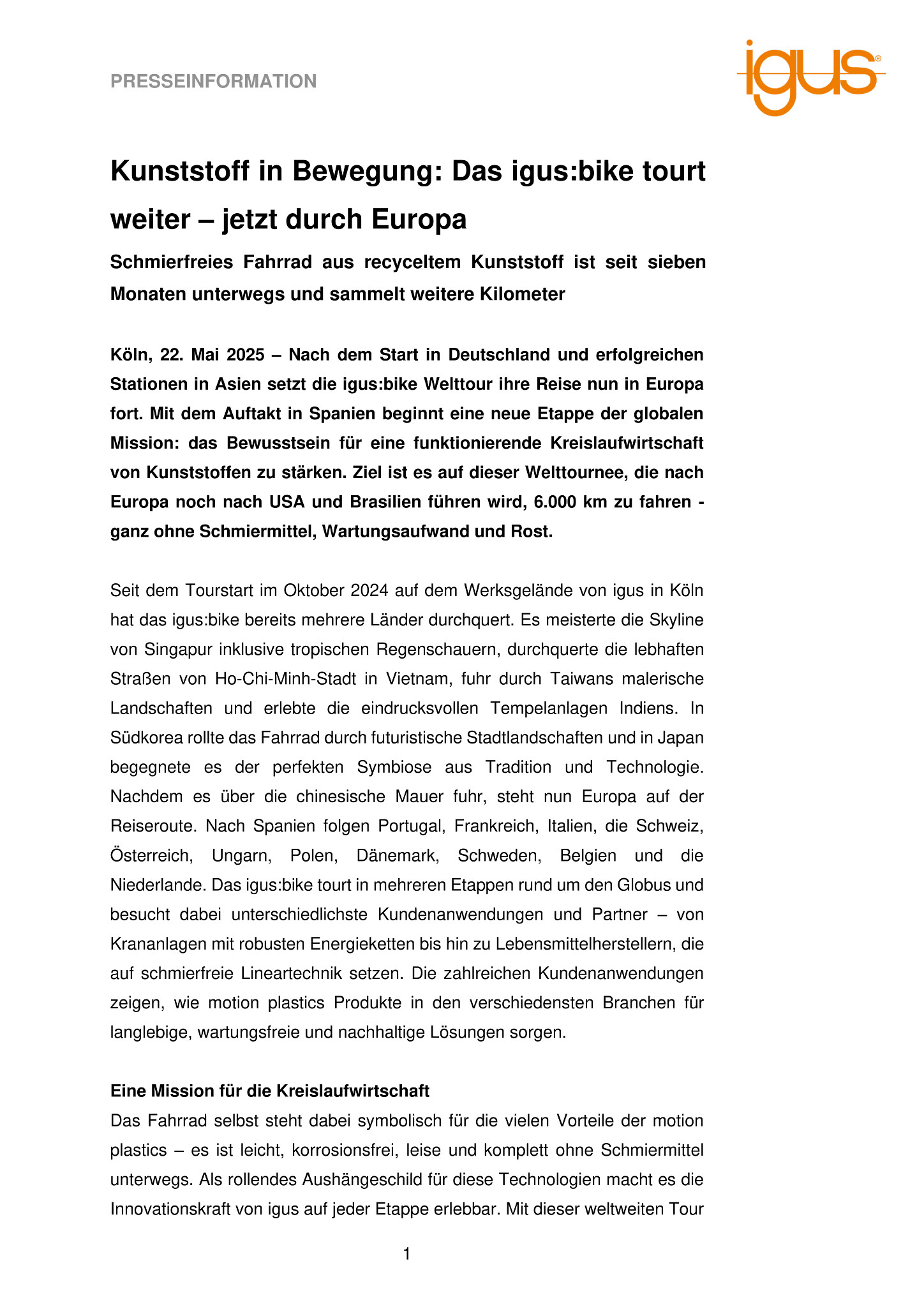 Köln, 22. Mai 2025 – Nach dem Start in Deutschland und erfolgreichen Stationen in Asien setzt die igus:bike Welttour ihre Reise nun in Europa fort. Mit dem Auftakt in Spanien beginnt eine neue Etappe der globalen Mission: das Bewusstsein für eine funktionierende Kreislaufwirtschaft von Kunststoffen zu stärken. Ziel ist es auf dieser Welttournee, die nach Europa noch nach USA und Brasilien führen wird, 6.000 km zu fahren – ganz ohne Schmiermittel, Wartungsaufwand und Rost.