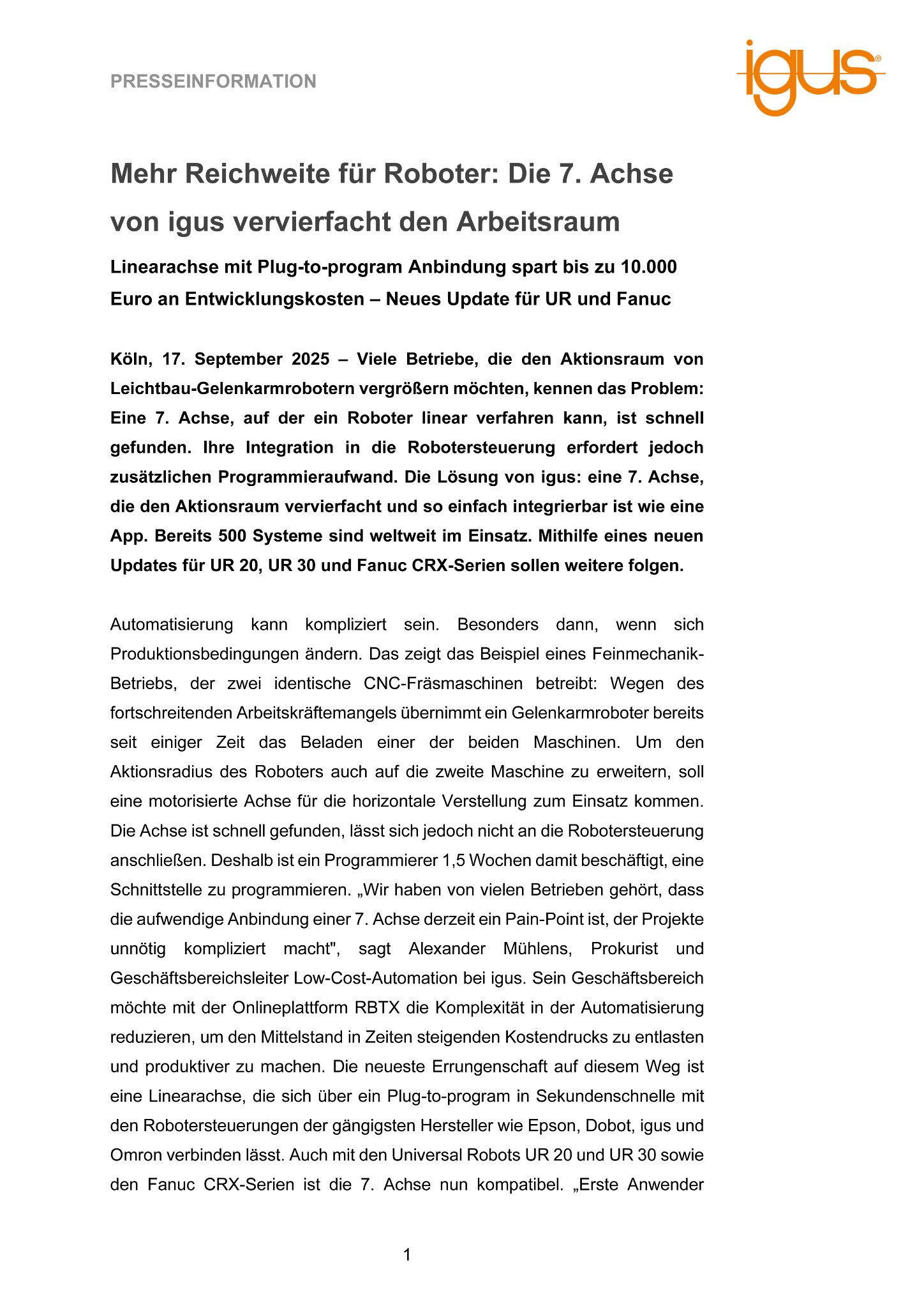 Köln, 17. September 2025 – Viele Betriebe, die den Aktionsraum von Leichtbau-Gelenkarmrobotern vergrößern möchten, kennen das Problem: Eine 7. Achse, auf der ein Roboter linear verfahren kann, ist schnell gefunden. Ihre Integration in die Robotersteuerung erfordert jedoch zusätzlichen Programmieraufwand. Die Lösung von igus: eine 7. Achse, die den Aktionsraum vervierfacht und so einfach integrierbar ist wie eine App. Bereits 500 Systeme sind weltweit im Einsatz. Mithilfe eines neuen Updates für UR 20, UR 30 und Fanuc CRX-Serien sollen weitere folgen.