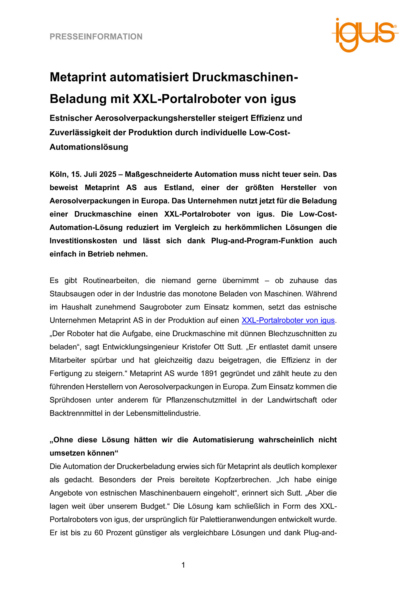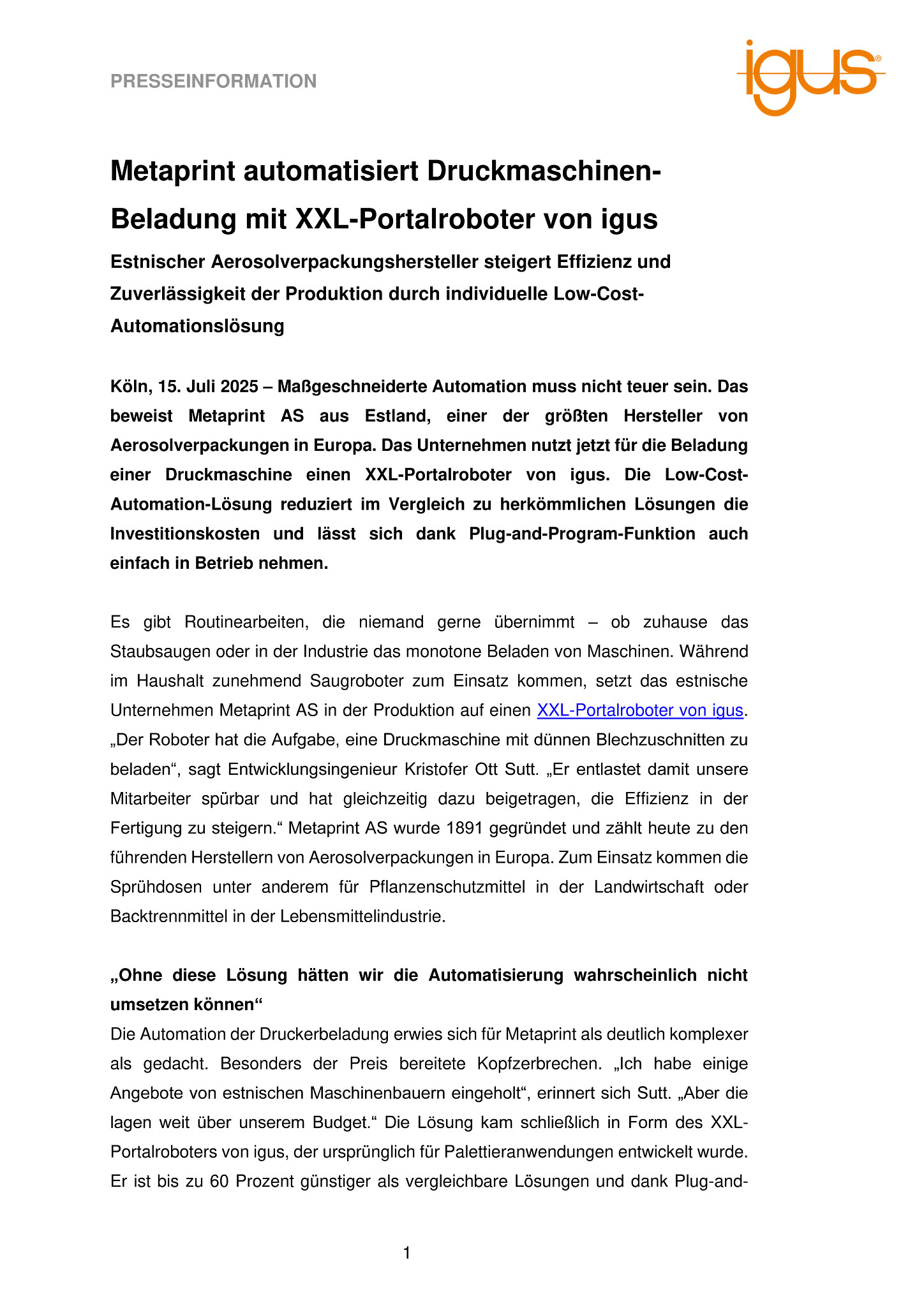 Köln, 15. Juli 2025 – Maßgeschneiderte Automation muss nicht teuer sein. Das beweist Metaprint AS aus Estland, einer der größten Hersteller von Aerosolverpackungen in Europa. Das Unternehmen nutzt jetzt für die Beladung einer Druckmaschine einen XXL-Portalroboter von igus. Die Low-Cost-Automation-Lösung reduziert im Vergleich zu herkömmlichen Lösungen die Investitionskosten und lässt sich dank Plug-and-Program-Funktion auch einfach in Betrieb nehmen.