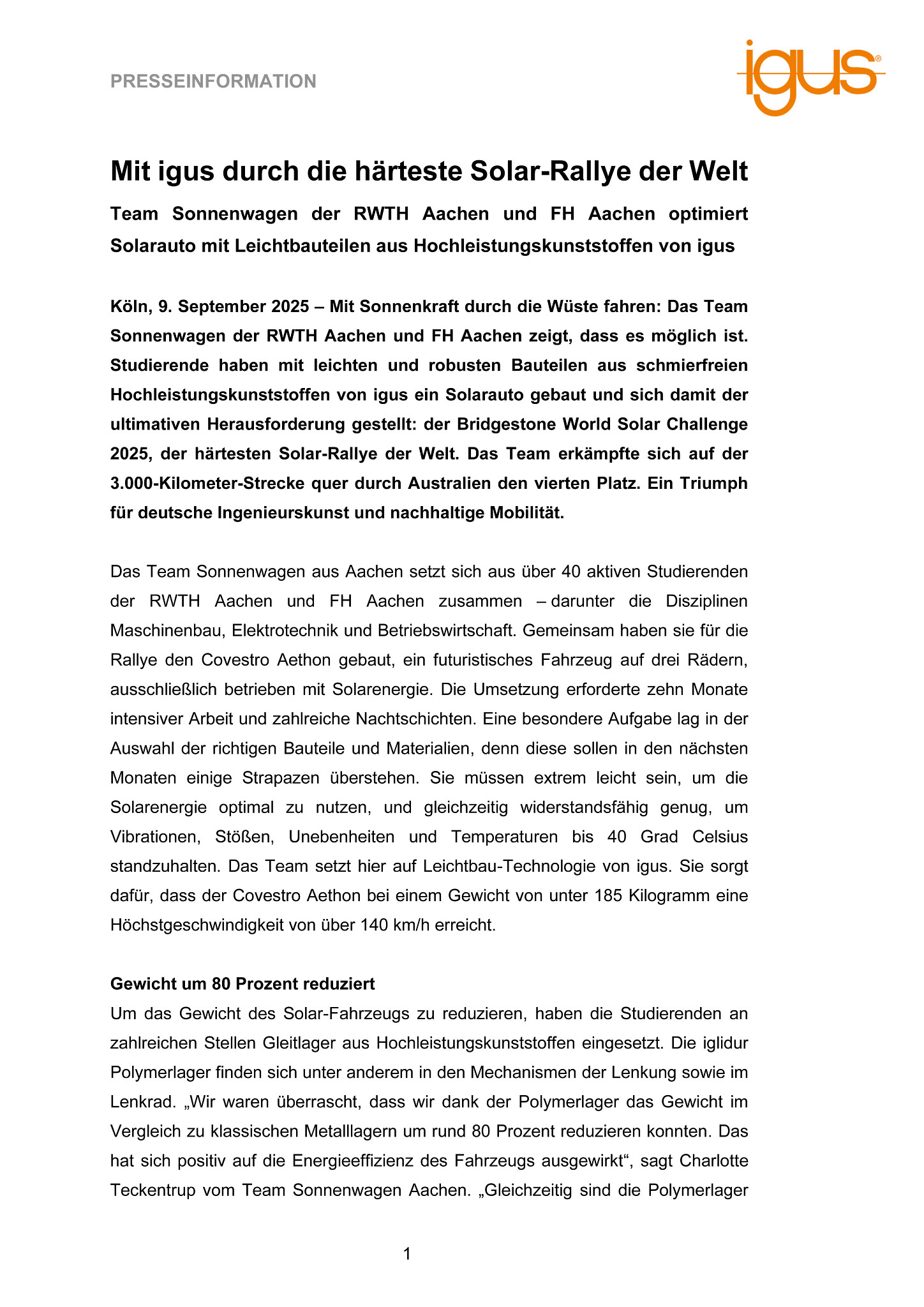 Köln, 9. September 2025 – Mit Sonnenkraft durch die Wüste fahren: Das Team Sonnenwagen der RWTH Aachen und FH Aachen zeigt, dass es möglich ist. Studierende haben mit leichten und robusten Bauteilen aus schmierfreien Hochleistungskunststoffen von igus ein Solarauto gebaut und sich damit der ultimativen Herausforderung gestellt: der Bridgestone World Solar Challenge 2025, der härtesten Solar-Rallye der Welt. Das Team erkämpfte sich auf der 3.000-Kilometer-Strecke quer durch Australien den vierten Platz. Ein Triumph für deutsche Ingenieurskunst und nachhaltige Mobilität.