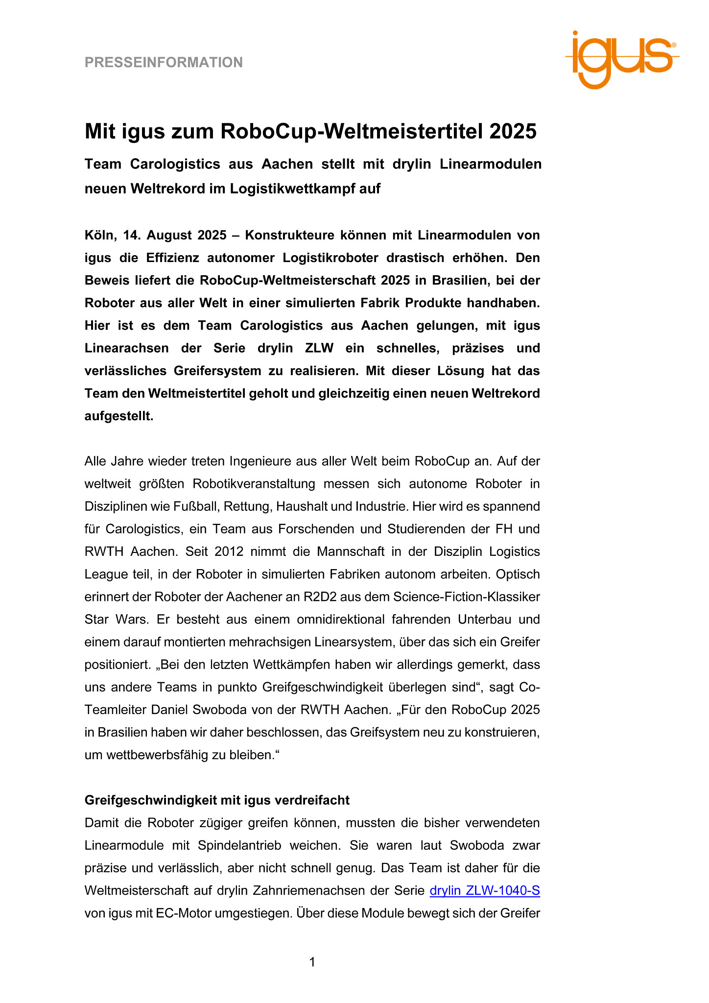 Köln, 14. August 2025 – Konstrukteure können mit Linearmodulen von igus die Effizienz autonomer Logistikroboter drastisch erhöhen. Den Beweis liefert die RoboCup-Weltmeisterschaft 2025 in Brasilien, bei der Roboter aus aller Welt in einer simulierten Fabrik Produkte handhaben. Hier ist es dem Team Carologistics aus Aachen gelungen, mit igus Linearachsen der Serie drylin ZLW ein schnelles, präzises und verlässliches Greifersystem zu realisieren. Mit dieser Lösung hat das Team den Weltmeistertitel geholt und gleichzeitig einen neuen Weltrekord aufgestellt.