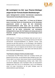 Köln/Hockenheimring, 13. August 2019 – 119 Teams aus 25 Nationen kamen in der letzten Woche zum Hockenheimring, um ihre Rennboliden gegeneinander antreten zu lassen. Bei dem internationalen Konstruktionswettbewerb zählte dieses Jahr der Leichtbau des Fahrzeuges zu einer der entscheidendsten Kriterien. Daher vertrauten die Studenten auf die leichte, schmiermittel- und wartungsfreie Gleitlagertechnik von igus. Ob in der Pedalerie, der Lenkung oder auch im Kettentrieb – die iglidur Tribo-Polymere bringen die Sportwagen schnell und sicher ins Ziel.