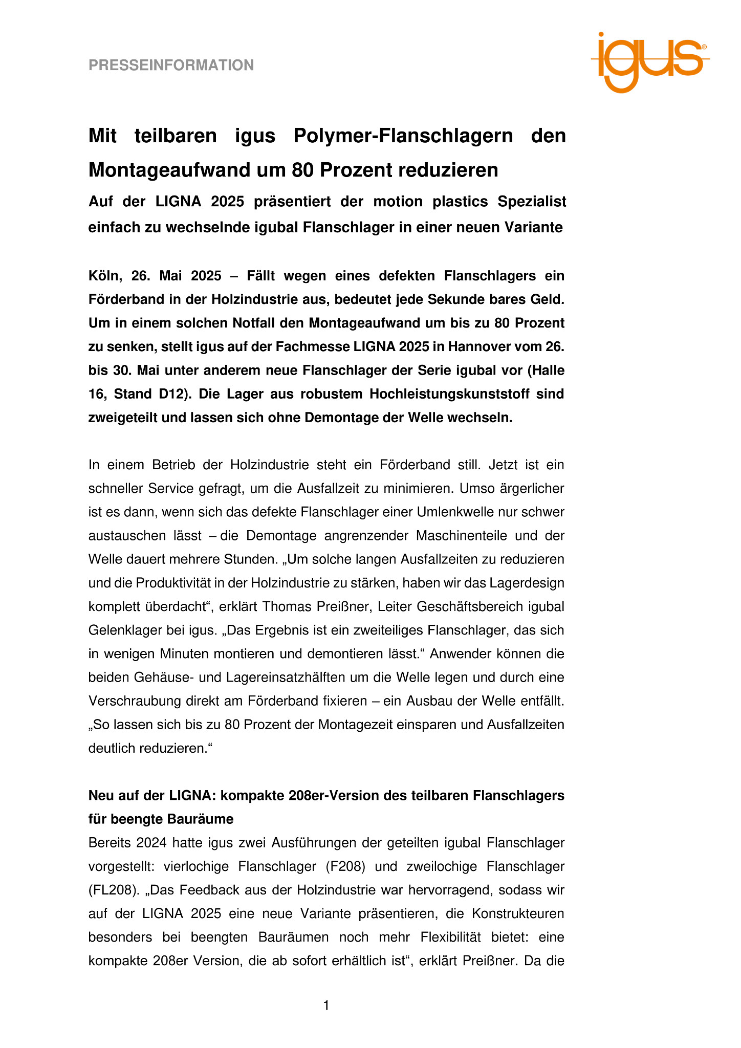 Fällt wegen eines defekten Flanschlagers ein Förderband in der Holzindustrie aus, bedeutet jede Sekunde bares Geld. Um in einem solchen Notfall den Montageaufwand um bis zu 80 Prozent zu senken, stellt igus auf der Fachmesse LIGNA 2025 in Hannover vom 26. bis 30. Mai unter anderem neue Flanschlager der Serie igubal vor (Halle 16, Stand D12). Die Lager aus robustem Hochleistungskunststoff sind zweigeteilt und lassen sich ohne Demontage der Welle wechseln.