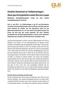 Köln, 6. Juni 2019 – An Tiefbohranlagen in der Öl- und Gas-Industrie herrschen oft extreme Bedingungen: Wind und Wetter, Schmutz sowie ein raues Handling der Anlagen und des Equipments wirken auf die Maschinenkomponenten ein. Für eine sichere Leitungsführung des Top Drives hat igus jetzt den e-loop entwickelt. Die neue modulare Energiekette aus Hochleistungskunststoffen sorgt für einen definierten Biegeradius der Leitungen und hält Vibrationen und Stößen stand.