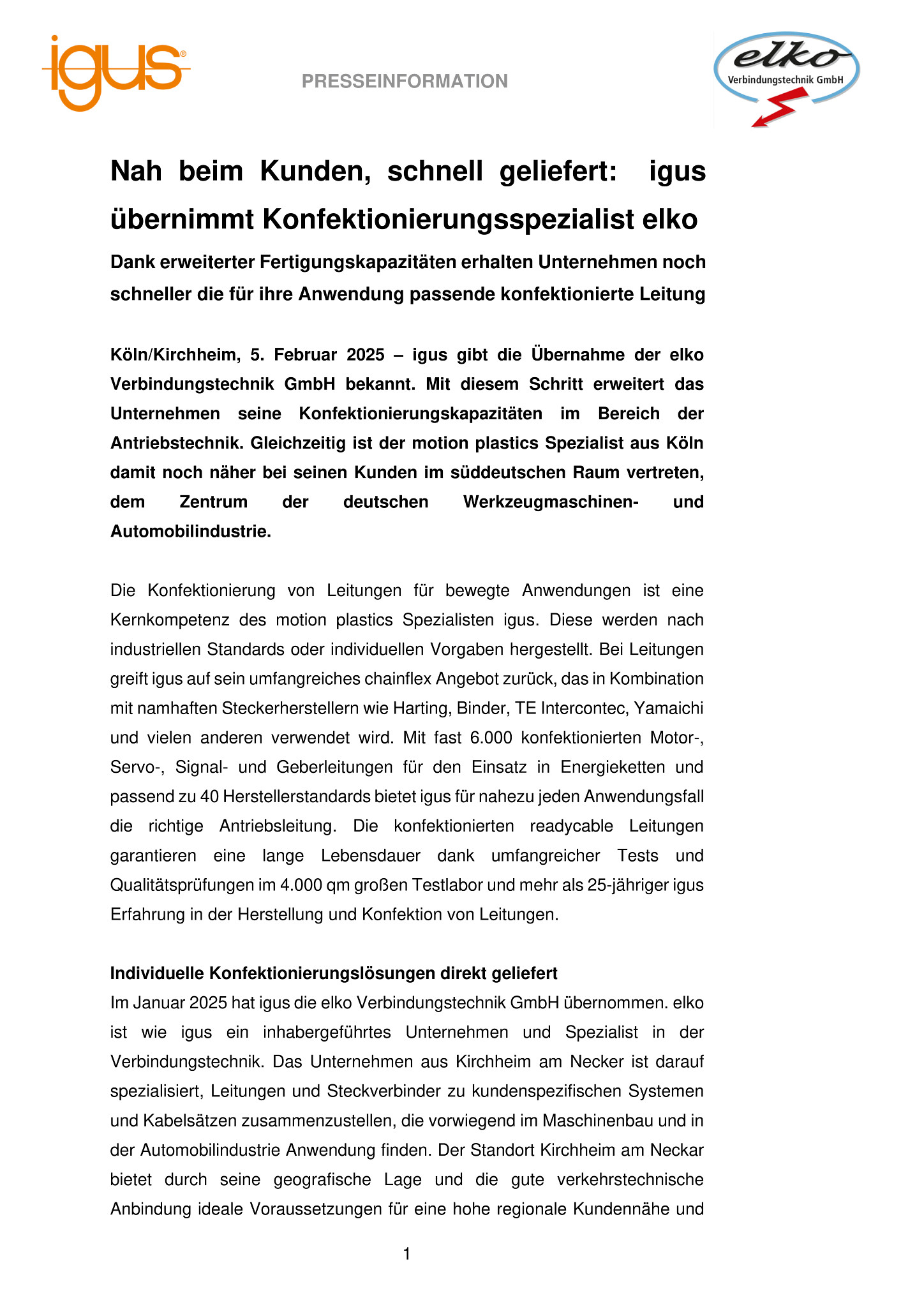 Nah beim Kunden, schnell geliefert: igus übernimmt Konfektionierungsspezialist elko