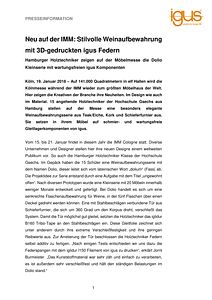 Köln, 19. Januar 2018 – Auf 141.000 Quadratmetern in elf Hallen wird die Kölnmesse während der IMM wieder zum größten Möbelhaus der Welt. Hier zeigen die Kreativen der Branche ihre Neuheiten. Im Design wie auch im Material. 15 angehende Holztechniker der Hochschule Gsechs aus Hamburg stellen auf der Messe eine besonders elegante Weinaufbewahrungsserie aus Teak/Eiche, Kork und Schieferfurnier aus. Sie setzen in ihrem Möbel auf schmier- und wartungsfreie Gleitlagerkomponenten von igus.