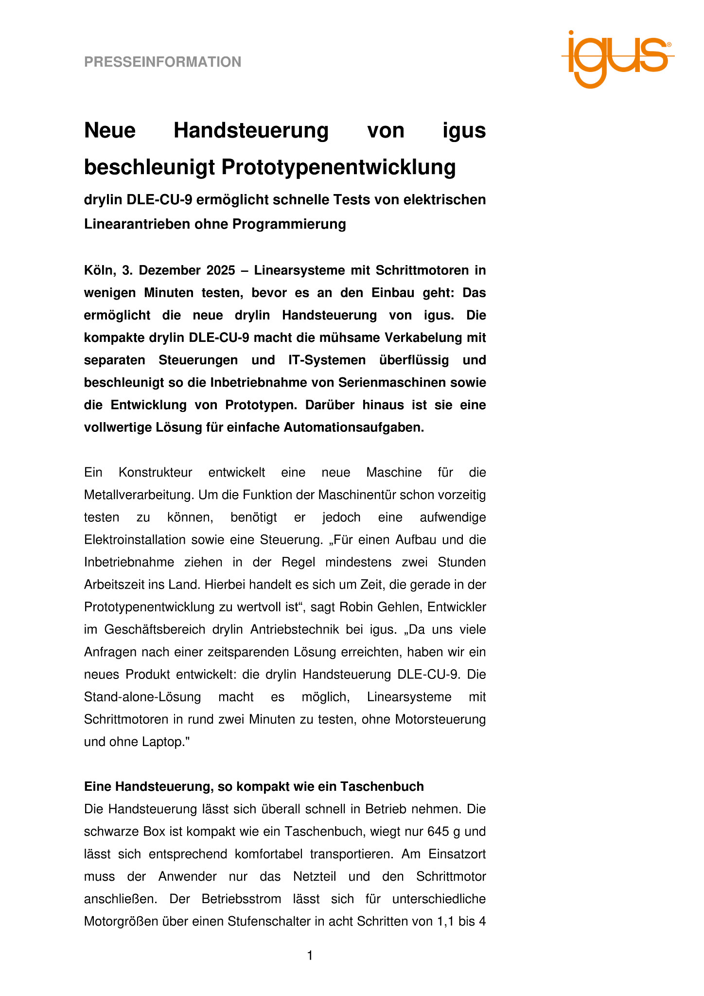 Köln, 3. Dezember 2025 – Linearsysteme mit Schrittmotoren in wenigen Minuten testen, bevor es an den Einbau geht: Das ermöglicht die neue drylin Handsteuerung von igus. Die kompakte drylin DLE-CU-9 macht die mühsame Verkabelung mit separaten Steuerungen und IT-Systemen überflüssig und beschleunigt so die Inbetriebnahme von Serienmaschinen sowie die Entwicklung von Prototypen. Darüber hinaus ist sie eine vollwertige Lösung für einfache Automationsaufgaben.