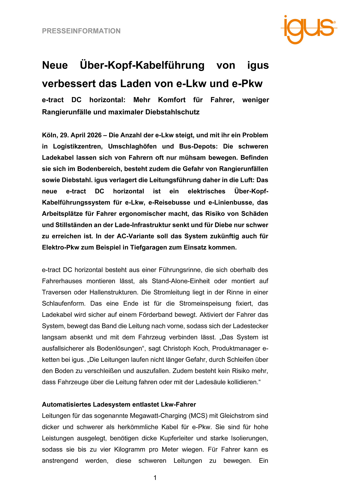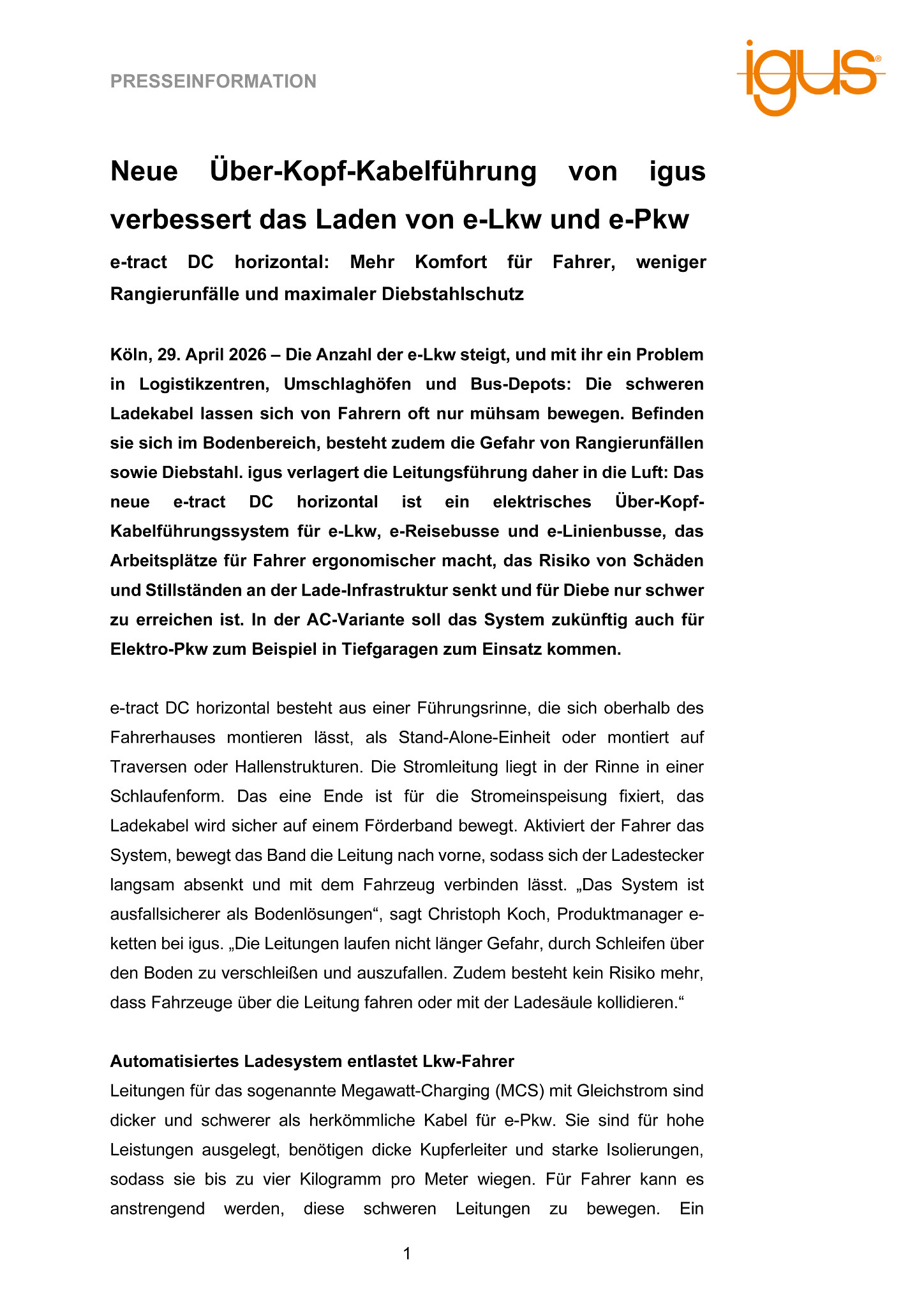 Köln, 29. April 2026 – Die Anzahl der e-Lkw steigt, und mit ihr ein Problem in Logistikzentren, Umschlaghöfen und Bus-Depots: Die schweren Ladekabel lassen sich von Fahrern oft nur mühsam bewegen. Befinden sie sich im Bodenbereich, besteht zudem die Gefahr von Rangierunfällen sowie Diebstahl. igus verlagert die Leitungsführung daher in die Luft: Das neue e-tract DC horizontal ist ein elektrisches Über-Kopf-Kabelführungssystem für e-Lkw, e-Reisebusse und e-Linienbusse, das Arbeitsplätze für Fahrer ergonomischer macht, das Risiko von Schäden und Stillständen an der Lade-Infrastruktur senkt und für Diebe nur schwer zu erreichen ist. In der AC-Variante soll das System zukünftig auch für Elektro-Pkw zum Beispiel in Tiefgaragen zum Einsatz kommen.