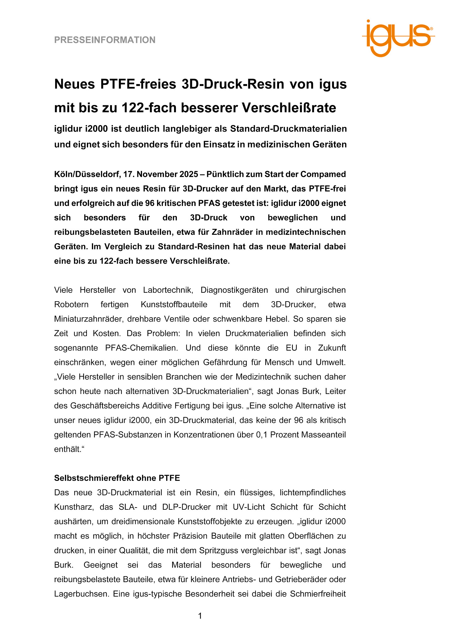 Köln/Düsseldorf, 17. November 2025 – Pünktlich zum Start der Compamed bringt igus ein neues Resin für 3D-Drucker auf den Markt, das PTFE-frei und erfolgreich auf die 96 kritischen PFAS getestet ist: iglidur i2000 eignet sich besonders für den 3D-Druck von beweglichen und reibungsbelasteten Bauteilen, etwa für Zahnräder in medizintechnischen Geräten. Im Vergleich zu Standard-Resinen hat das neue Material dabei eine bis zu 122-fach bessere Verschleißrate.