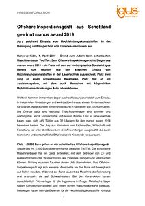 Hannover/Köln, 4. April 2019 – Grund zum Jubeln beim schottischen Maschinenbauer ToolTec: Sein Offshore-Inspektionsgerät ist Sieger des manus award 2019 – ein Preis, mit dem der motion plastics Spezialist igus bereits zum neunten Mal den kreativen Einsatz von Hochleistungskunststoffen in der Lagertechnik auszeichnet. Platz zwei ging an einen schwebenden Katamaran, Platz drei an ein Assistenzsystem, mit dem auch Menschen mit körperlichen Mobilitätseinschränkungen Auto fahren können.
