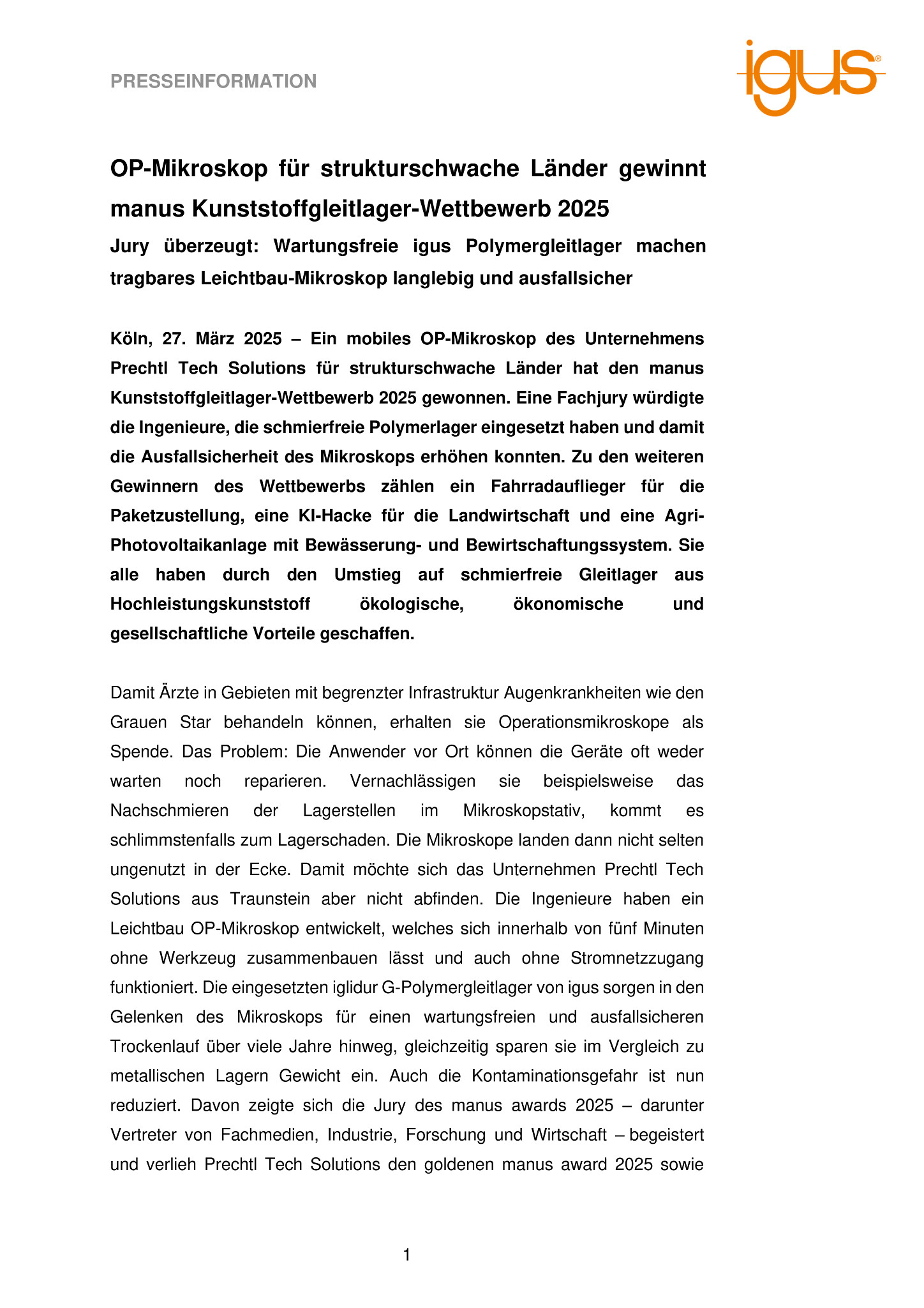 Damit Ärzte in Gebieten mit begrenzter Infrastruktur Augenkrankheiten wie den Grauen Star behandeln können, erhalten sie Operationsmikroskope als Spende. Das Problem: Die Anwender vor Ort können die Geräte oft weder warten noch reparieren. Vernachlässigen sie beispielsweise das Nachschmieren der Lagerstellen im Mikroskopstativ, kommt es schlimmstenfalls zum Lagerschaden. Die Mikroskope landen dann nicht selten ungenutzt in der Ecke. Damit möchte sich das Unternehmen Prechtl Tech Solutions aus Traunstein aber nicht abfinden. Die Ingenieure haben ein Leichtbau OP-Mikroskop entwickelt, welches sich innerhalb von fünf Minuten ohne Werkzeug zusammenbauen lässt und auch ohne Stromnetzzugang funktioniert. Die eingesetzten iglidur G-Polymergleitlager von igus sorgen in den Gelenken des Mikroskops für einen wartungsfreien und ausfallsicheren Trockenlauf über viele Jahre hinweg, gleichzeitig sparen sie im Vergleich zu metallischen Lagern Gewicht ein. Auch die Kontaminationsgefahr ist nun reduziert. Davon zeigte sich die Jury des manus awards 2025 – darunter Vertreter von Fachmedien, Industrie, Forschung und Wirtschaft – begeistert und verlieh Prechtl Tech Solutions den goldenen manus award 2025 sowie 5.000 Euro Preisgeld. Die Experten lobten den kreativen Ansatz und die einfache und wirtschaftliche Umsetzung mit einem hohen sozialen Nutzen.