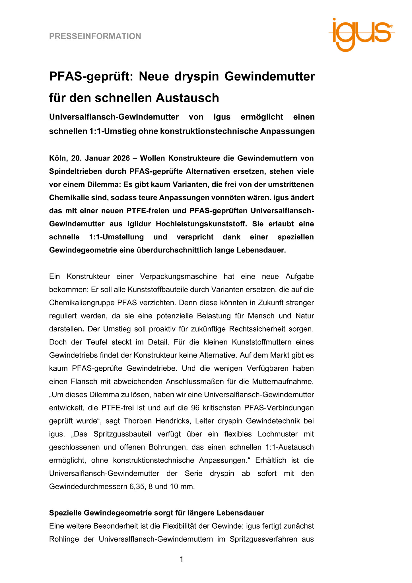 Köln, 20. Januar 2026 – Wollen Konstrukteure die Gewindemuttern von Spindeltrieben durch PFAS-geprüfte Alternativen ersetzen, stehen viele vor einem Dilemma: Es gibt kaum Varianten, die frei von der umstrittenen Chemikalie sind, sodass teure Anpassungen vonnöten wären. igus ändert das mit einer neuen PTFE-freien und PFAS-geprüften Universalflansch-Gewindemutter aus iglidur Hochleistungskunststoff. Sie erlaubt eine schnelle 1:1-Umstellung und verspricht dank einer speziellen Gewindegeometrie eine überdurchschnittlich lange Lebensdauer.