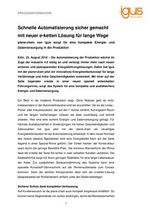 Köln, 23. August 2018 – Die Automatisierung der Produktion wächst im Zuge der Industrie 4.0 stetig an und verlangt immer mehr nach neuen sicheren und platzsparenden Energieführungslösungen. Daher hat igus mit der plane-chain jetzt ein innovatives Energiekettenkonzept für lange Verfahrwege und hohe Geschwindigkeiten entwickelt. Mit einer auf der Seite liegenden e-kette in einer neuen speziell entwickelten Führungsrinne, sorgt das System für eine kompakte und ausfallsichere Energie- und Datenversorgung.