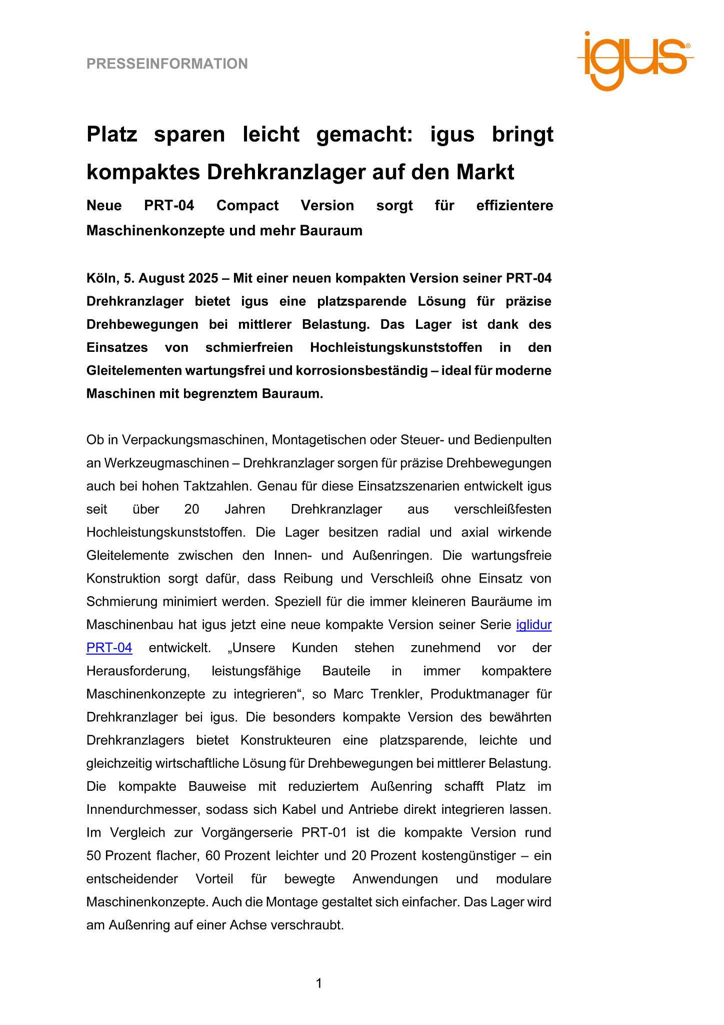 Köln, 5. August 2025 – Mit einer neuen kompakten Version seiner PRT-04 Drehkranzlager bietet igus eine platzsparende Lösung für präzise Drehbewegungen bei mittlerer Belastung. Das Lager ist dank des Einsatzes von schmierfreien Hochleistungskunststoffen in den Gleitelementen wartungsfrei und korrosionsbeständig – ideal für moderne Maschinen mit begrenztem Bauraum.