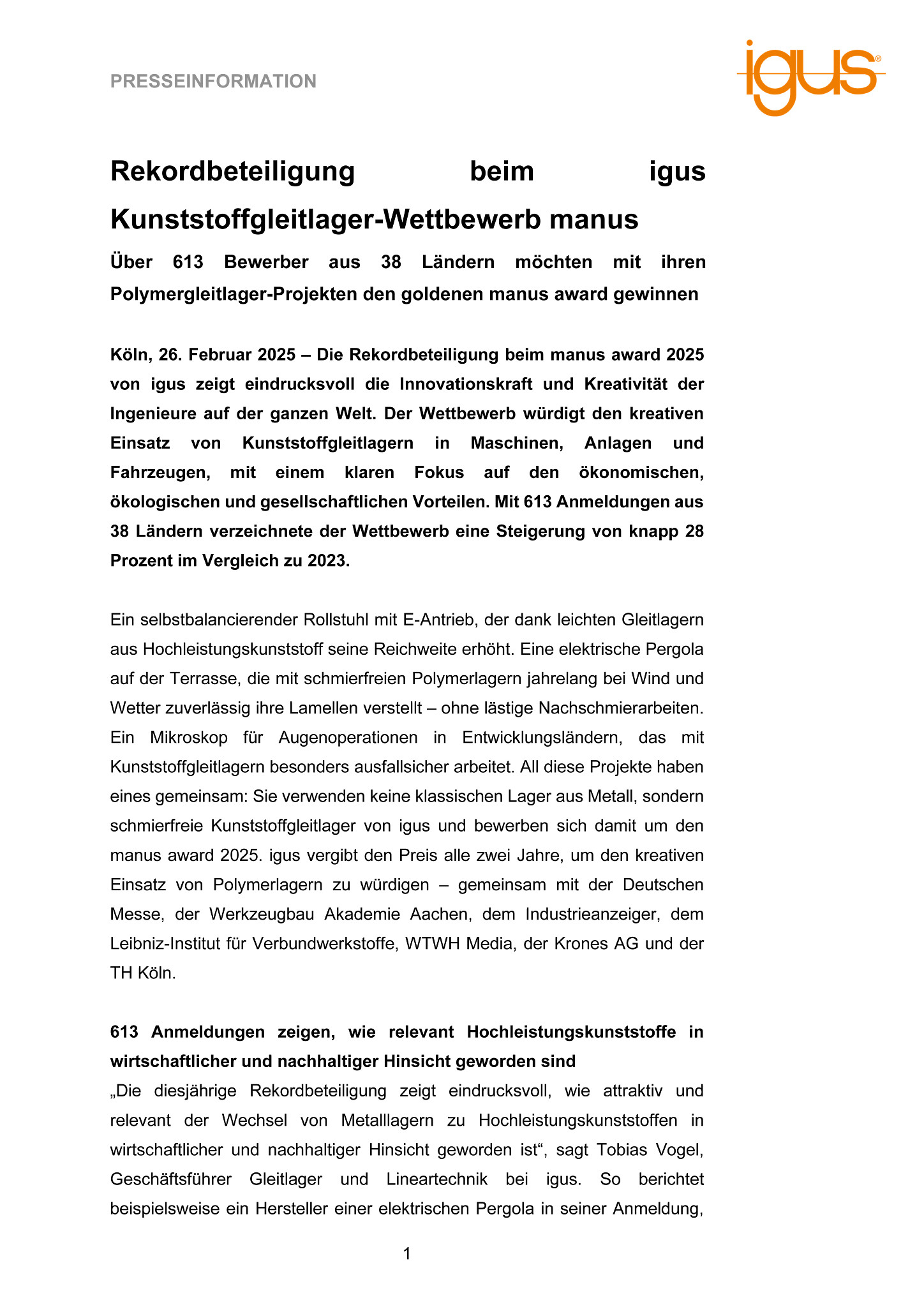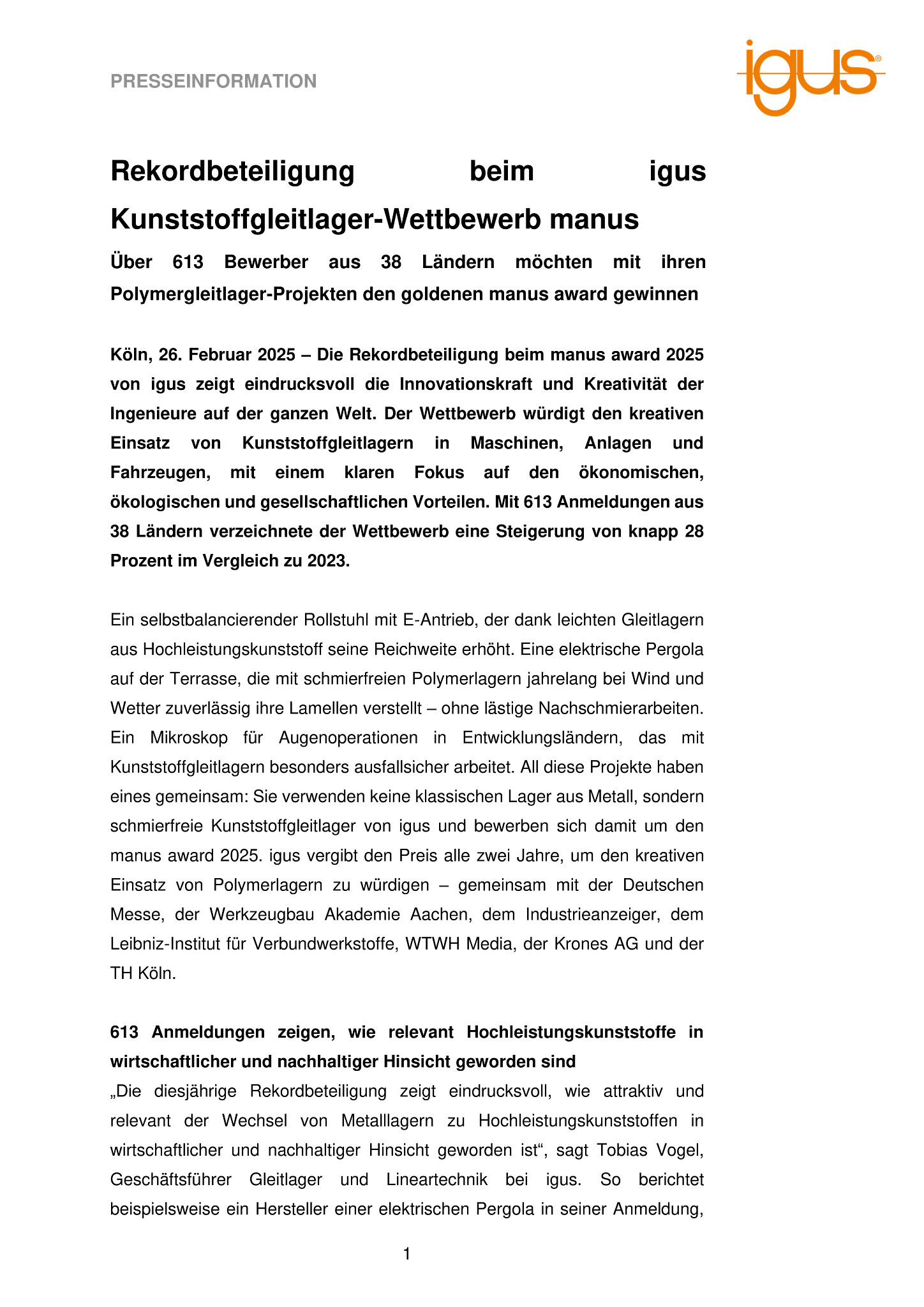 Köln, 26. Februar 2025 – Die Rekordbeteiligung beim manus award 2025 von igus zeigt eindrucksvoll die Innovationskraft und Kreativität der Ingenieure auf der ganzen Welt. Der Wettbewerb würdigt den kreativen Einsatz von Kunststoffgleitlagern in Maschinen, Anlagen und Fahrzeugen, mit einem klaren Fokus auf den ökonomischen, ökologischen und gesellschaftlichen Vorteilen. Mit 613 Anmeldungen aus 38 Ländern verzeichnete der Wettbewerb eine Steigerung von knapp 28 Prozent im Vergleich zu 2023.