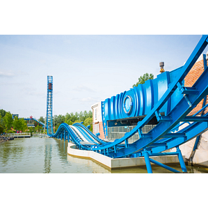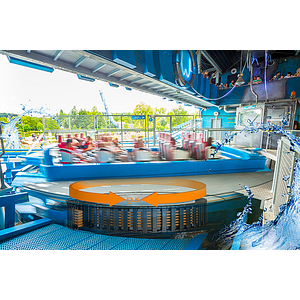 Rückwärts hoch, vorwärts runter und das mal zwei: So fühlt sich das Fahrerlebnis mit der Power Splash Wasserbahn der Firma Mack Rides an. Unter dem Namen „Pulsar“ ist das erste Modell der 2000 PS starken Wasserbahn im belgischen Freizeitpark Walibi zu finden. Mit einer Geschwindigkeit von 100 km/h und einer Fallhöhe von 45 Metern rasen hier Besucher ins kühle Nass, Erfrischung inklusive. Damit die Fahrgäste sicher ein- und aussteigen können, bauten die Entwickler der Wasserbahn eine Drehweiche ein, die besondere Anforderungen an die Energieführung stellte. Denn diese muss Leitungen um +/- 180 Grad bewegen können. Daher wandten sich die Konstrukteure an das Engineering Team des motion plastics Spezialisten igus, die eine modulare Drehenergieführung mit einer auf der Seite liegenden Energiekette auslegten. Sie kann Leitungen in der gewünschten Rotation problemlos und zuverlässig führen.