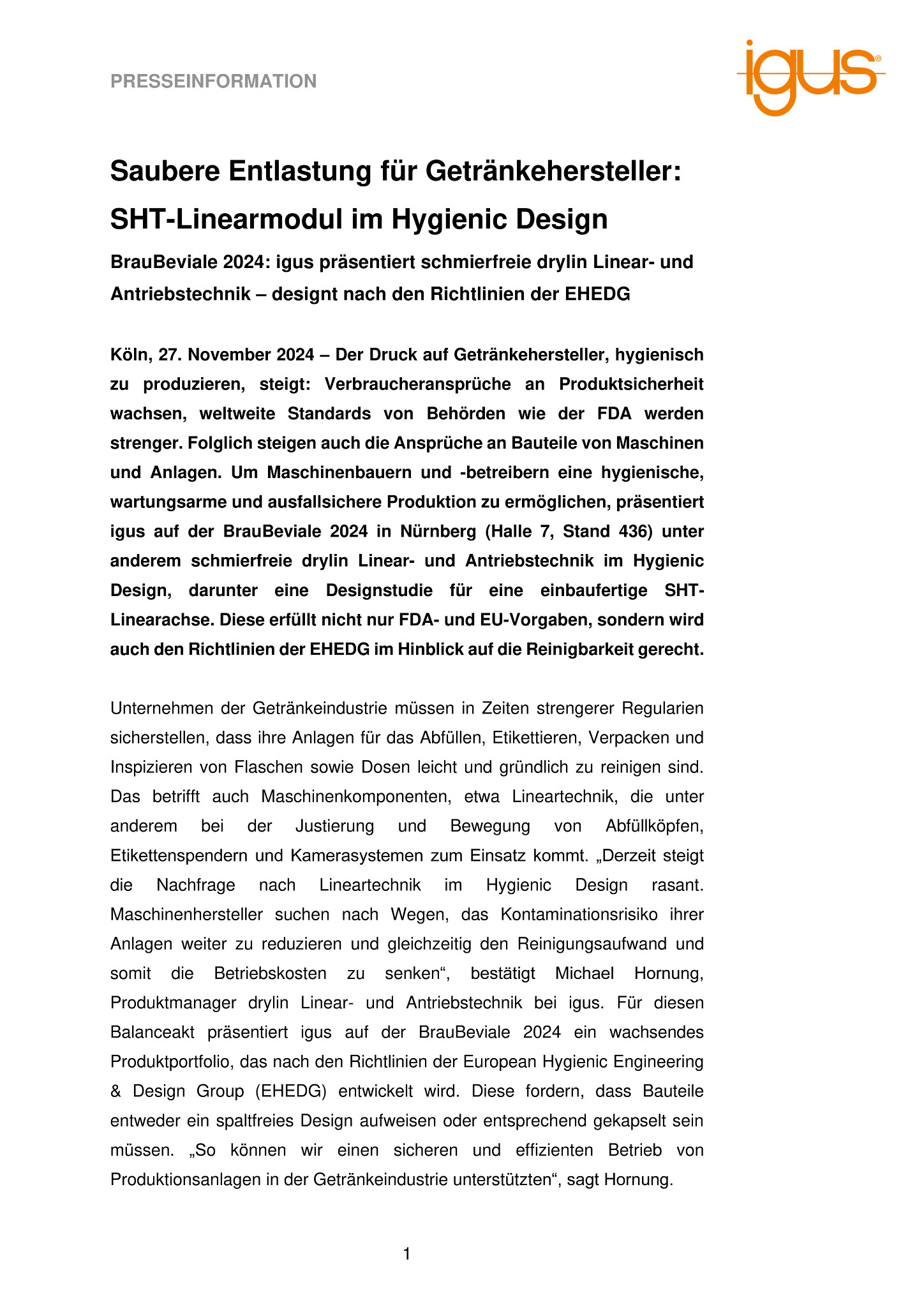 Köln, 27. November 2024 – Der Druck auf Getränkehersteller, hygienisch zu produzieren, steigt: Verbraucheransprüche an Produktsicherheit wachsen, weltweite Standards von Behörden wie der FDA werden strenger. Folglich steigen auch die Ansprüche an Bauteile von Maschinen und Anlagen. Um Maschinenbauern und -betreibern eine hygienische, wartungsarme und ausfallsichere Produktion zu ermöglichen, präsentiert igus auf der BrauBeviale 2024 in Nürnberg (Halle 7, Stand 436) unter anderem schmierfreie drylin Linear- und Antriebstechnik im Hygienic Design, darunter eine Designstudie für eine einbaufertige SHT-Linearachse. Diese erfüllt nicht nur FDA- und EU-Vorgaben, sondern wird auch den Richtlinien der EHEDG im Hinblick auf die Reinigbarkeit gerecht.